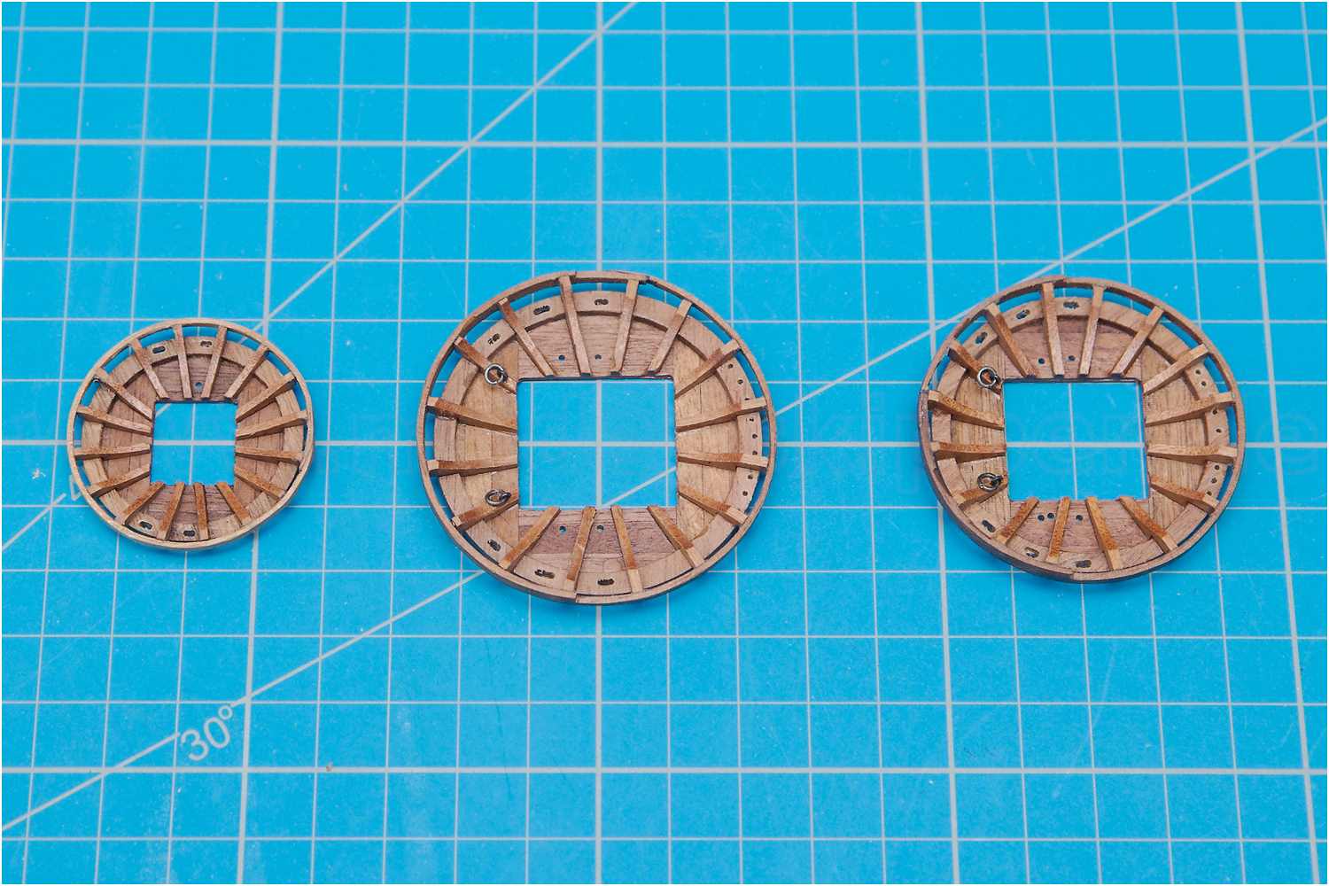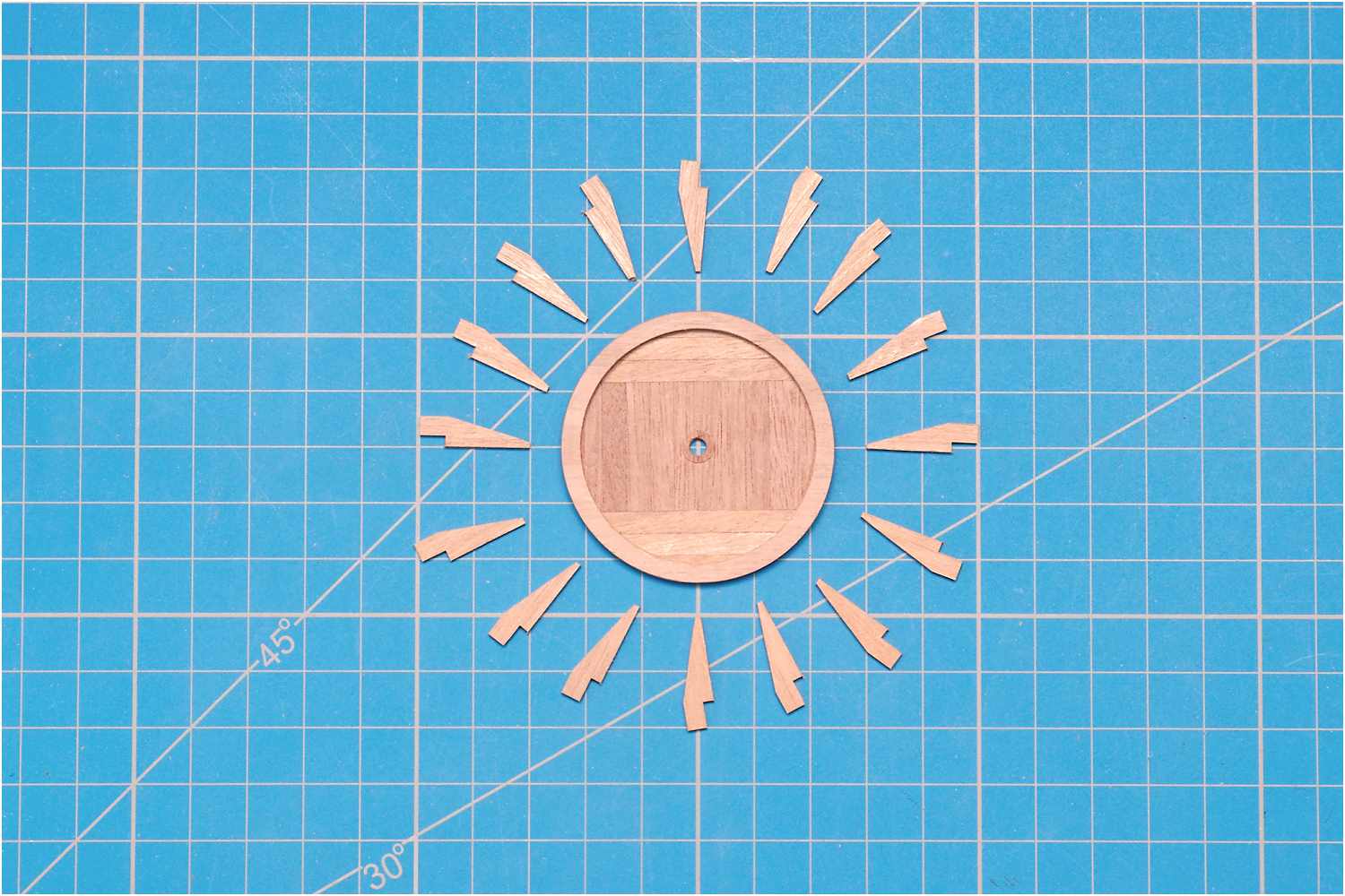Der Boden der Plattformen wurde aus einzelnen Leisten zusammengeklebt und mit Hilfe eines Aufnahmedorns für Trennscheiben in der Handbohrmaschine auf Maß abgeschliffen.