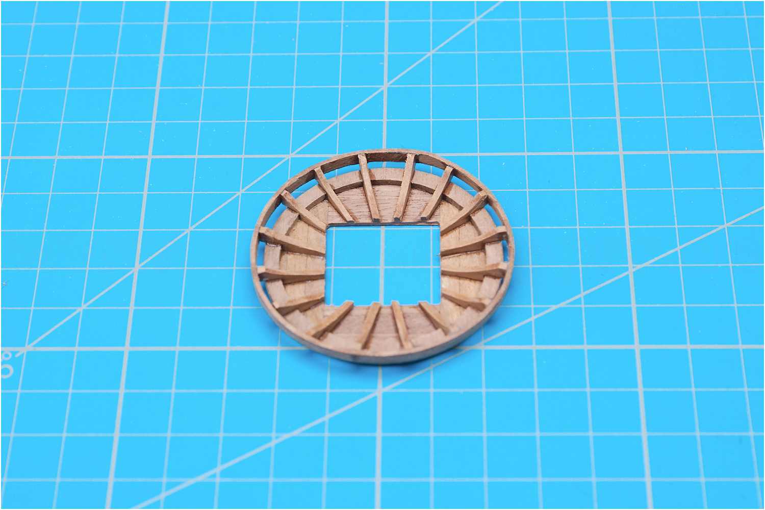 Der Abschlussring wurde vorgebogen, die Plattform verkehrt herum auf ein Holzbrettchen mit Frischhaltefolie gelegt und der Ring an die Rippen geklebt.