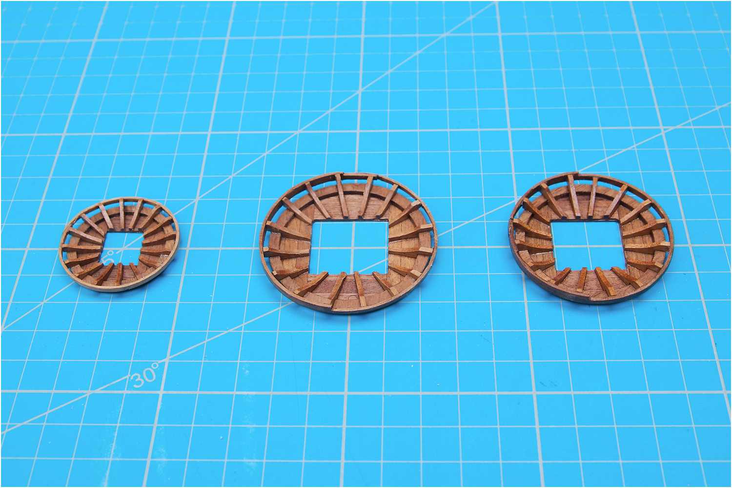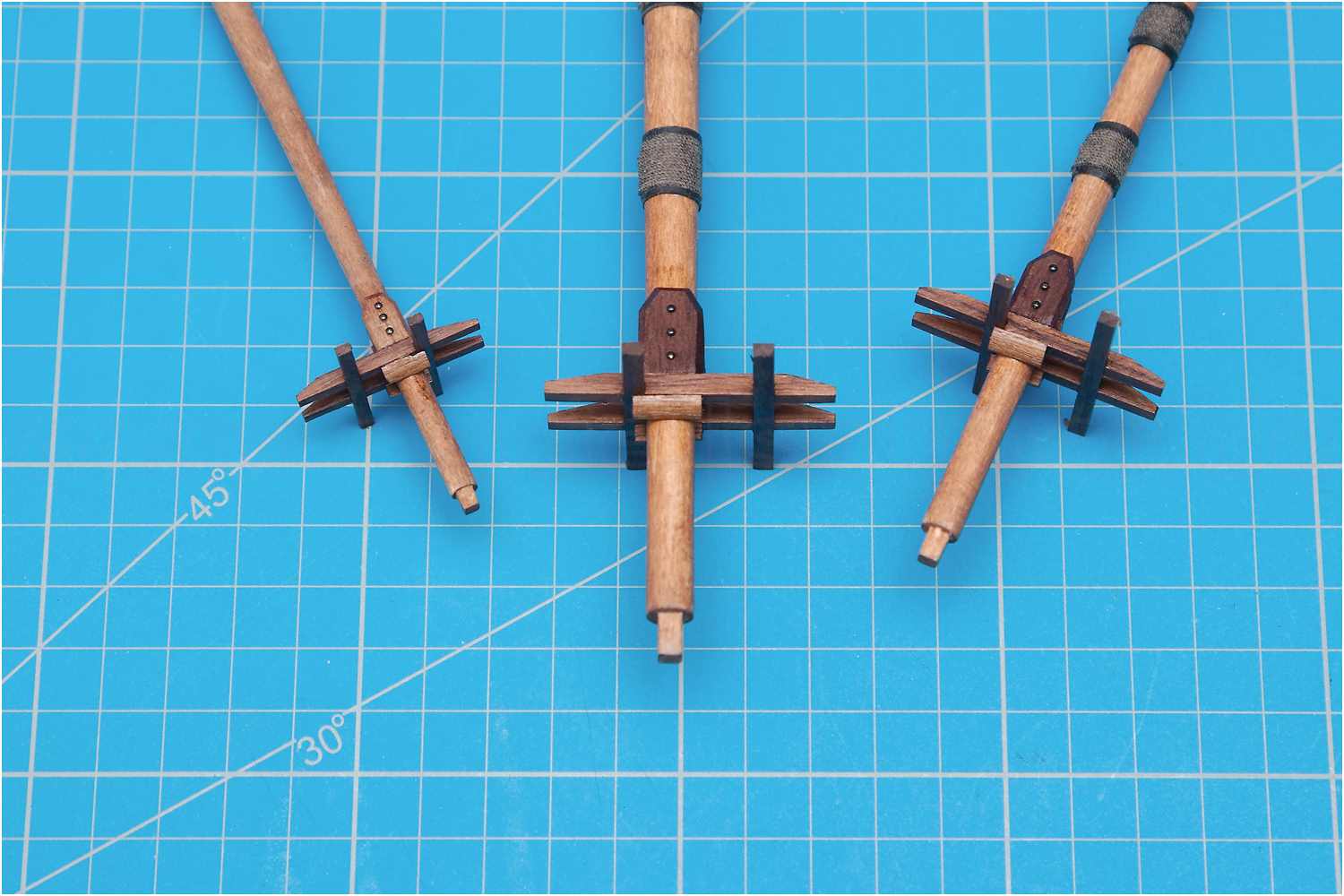 Für die Rippen der Marsplattformen habe ich passende Leistenstücken zugeschnitten und alle hochkant auf Malerkrepp fixiert, so konnte das Paket problemlos im Schraubstock eingespannt werden.