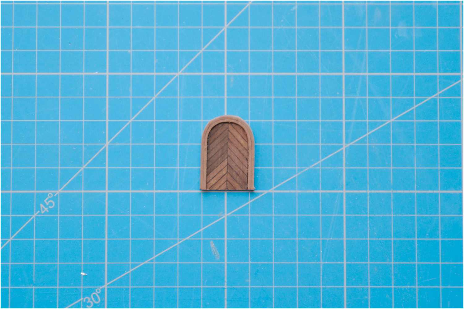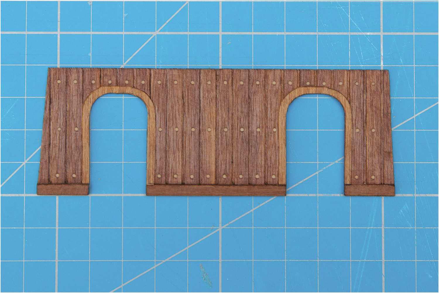 Die fertigen Türflügel habe ich dann an die Öffnung des Schotts angepasst, als Türrahmen eine gebogene Leiste an der Außenkante verklebt und in das Schott eingesetzt.