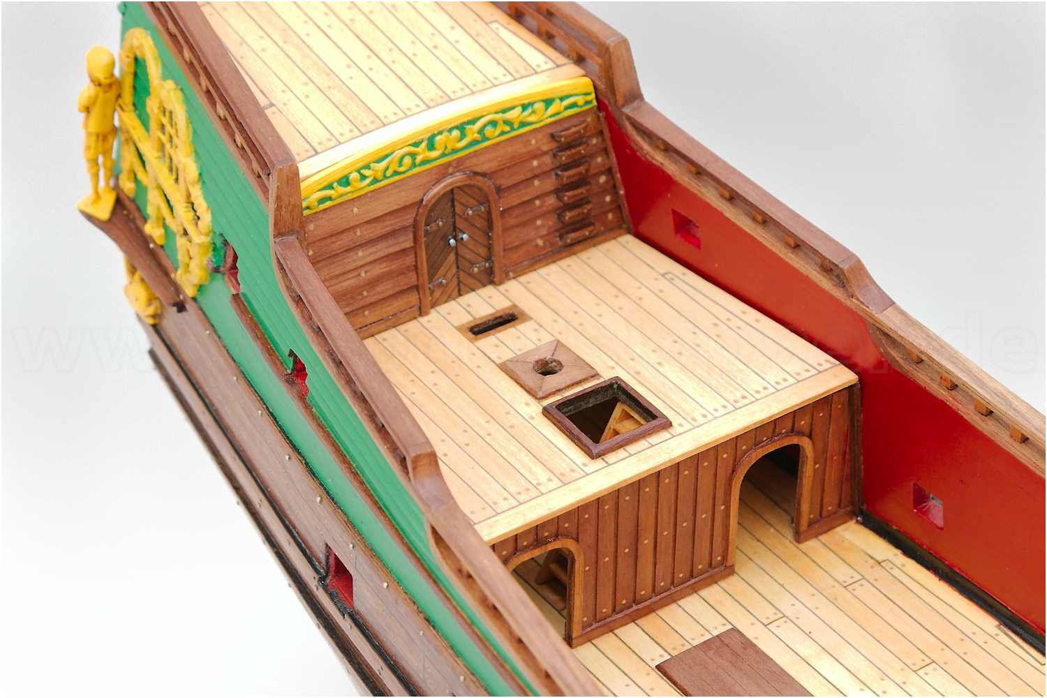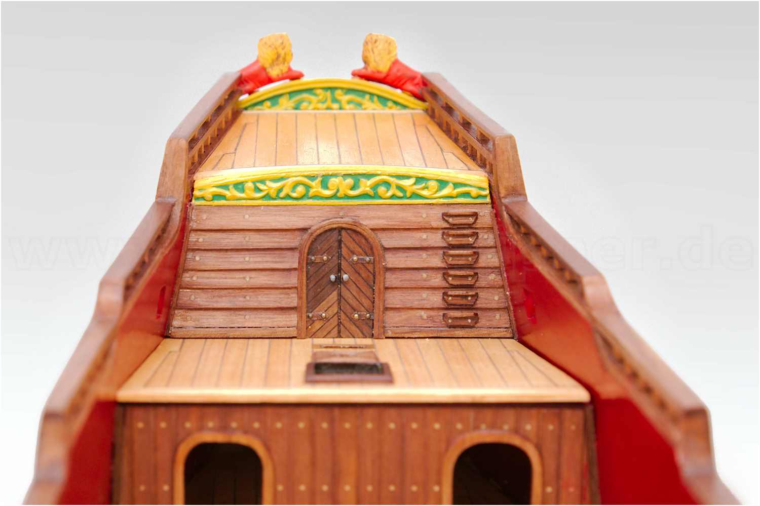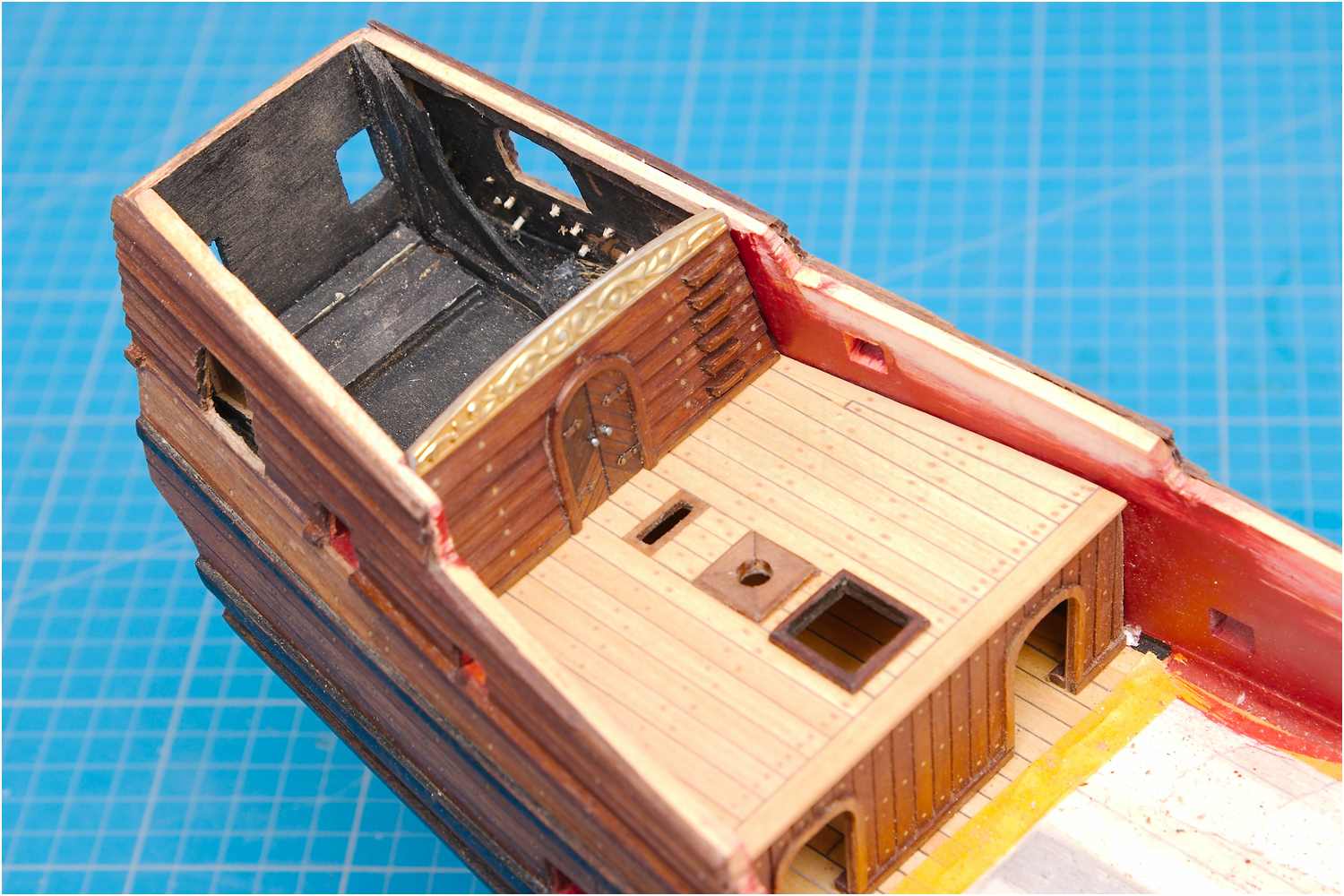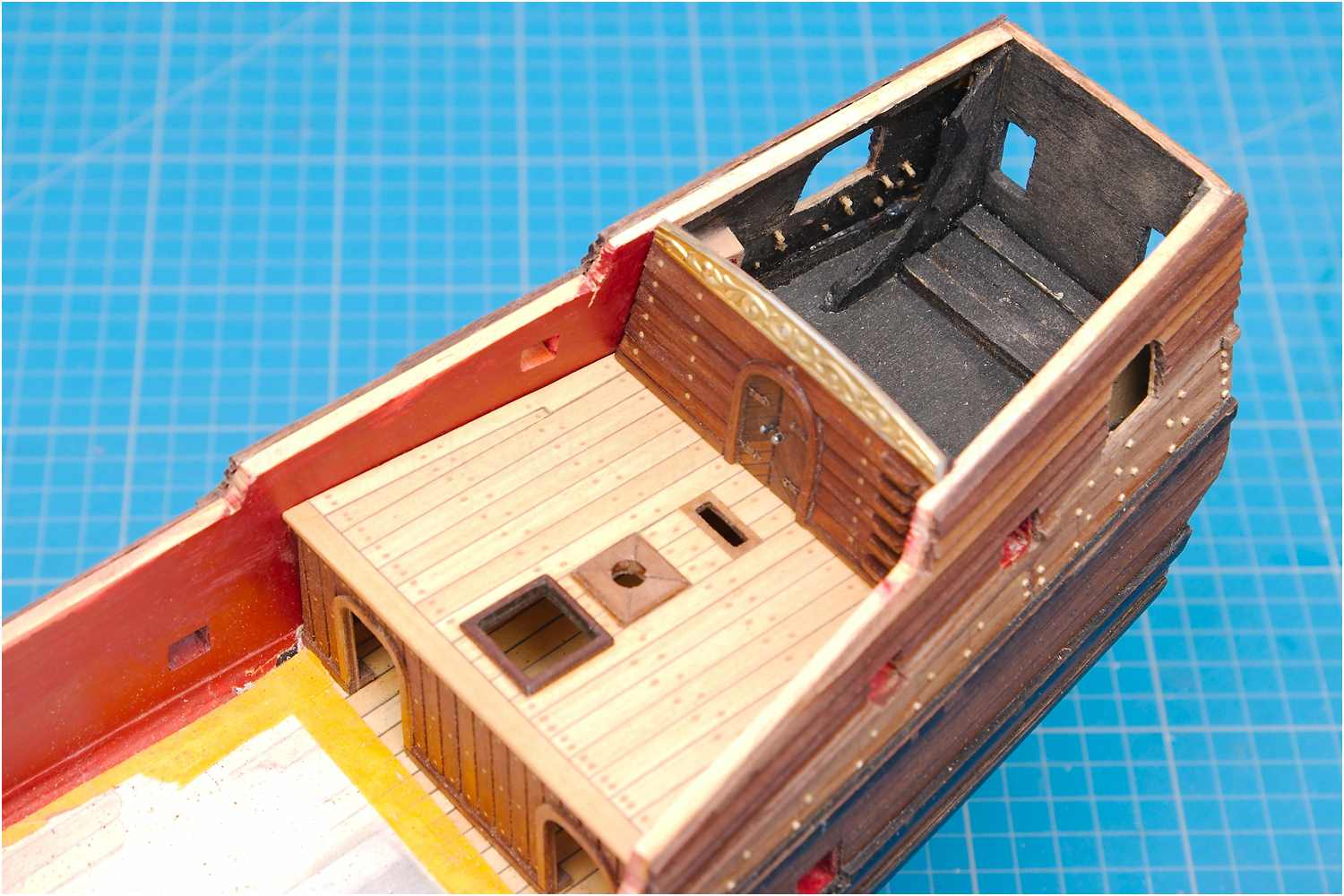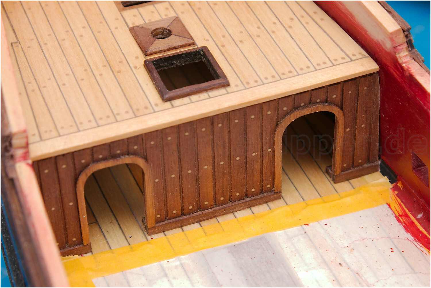 Abschließend noch Dübel eingesetzt, Scharnierbänder und Türgriffe aufgeklebt und am Schott die Stufen der Leiter zum Hüttendeck angebracht.