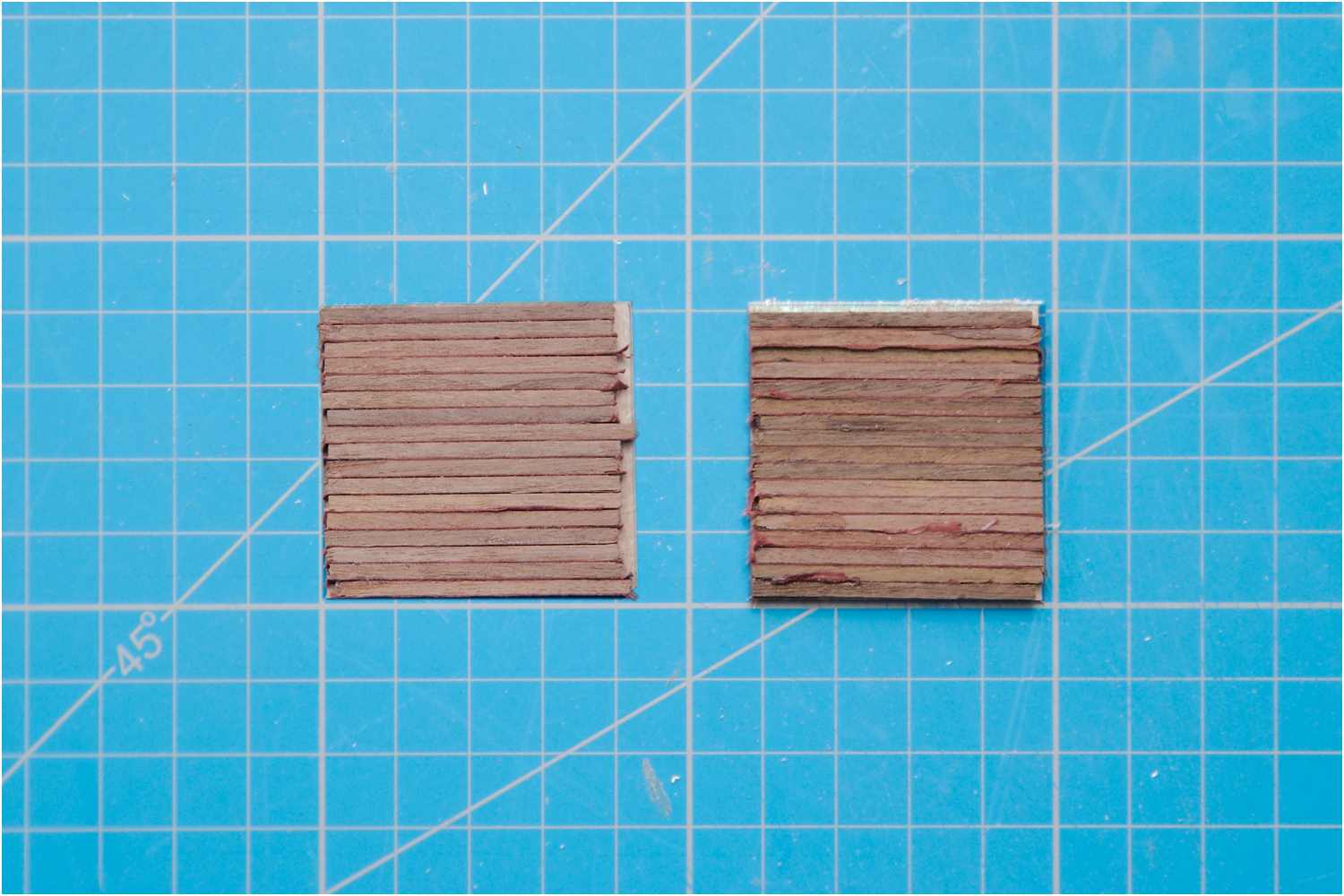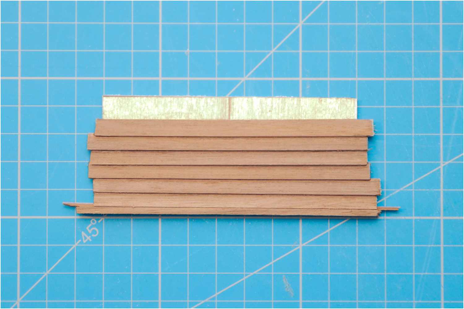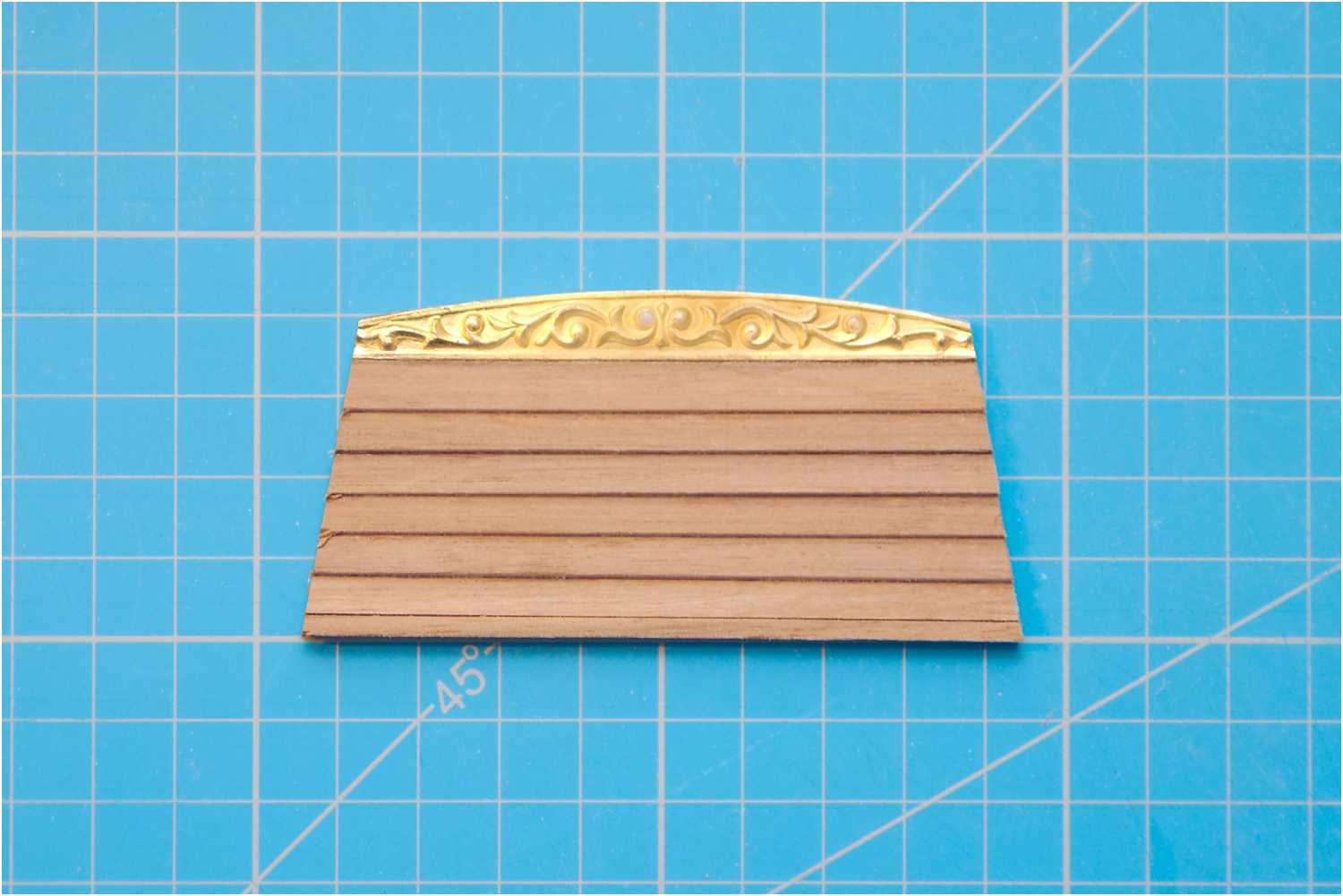 Für die Herstellung des Schotts unter der Kampanje wurde auf ein Stück Sperrholz erst eine 2 mm dicke Sockelleiste geklebt. Für die senkrechten Wandbretter habe ich 1 mm Nussbaum genommen um so einen kleinen Absatz erhalten.