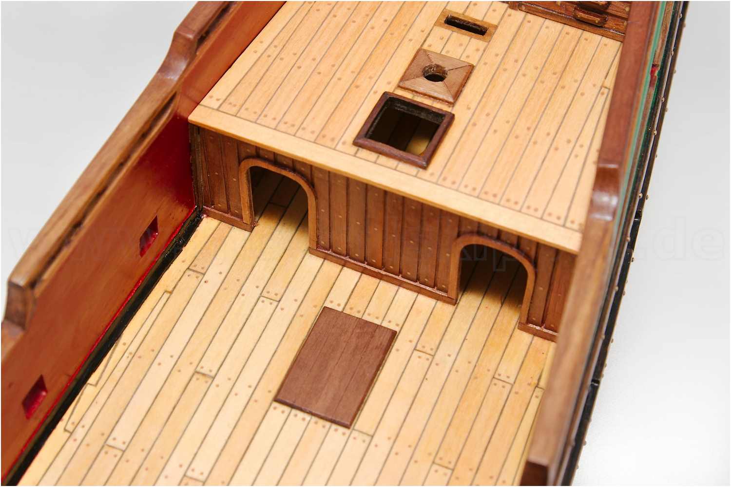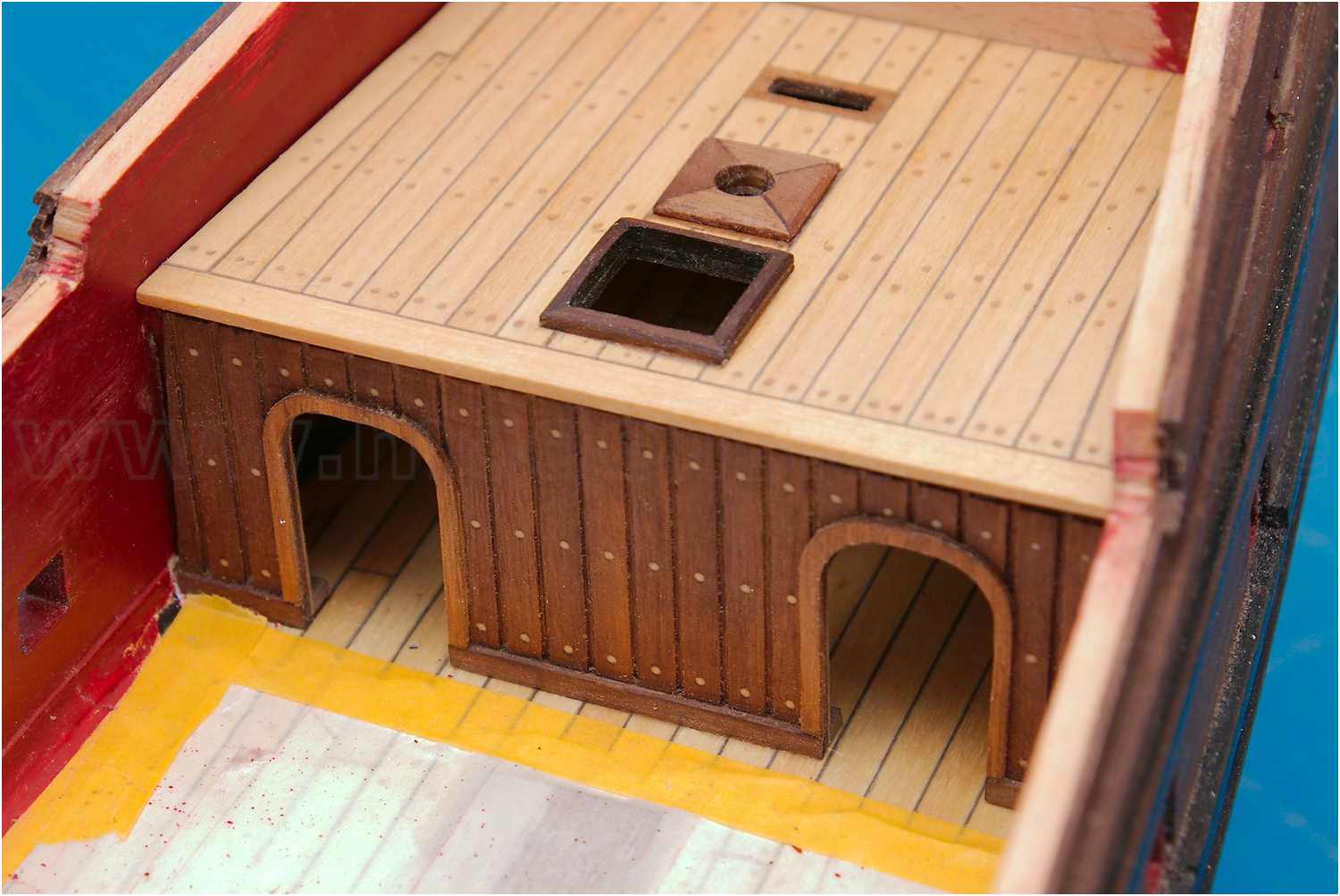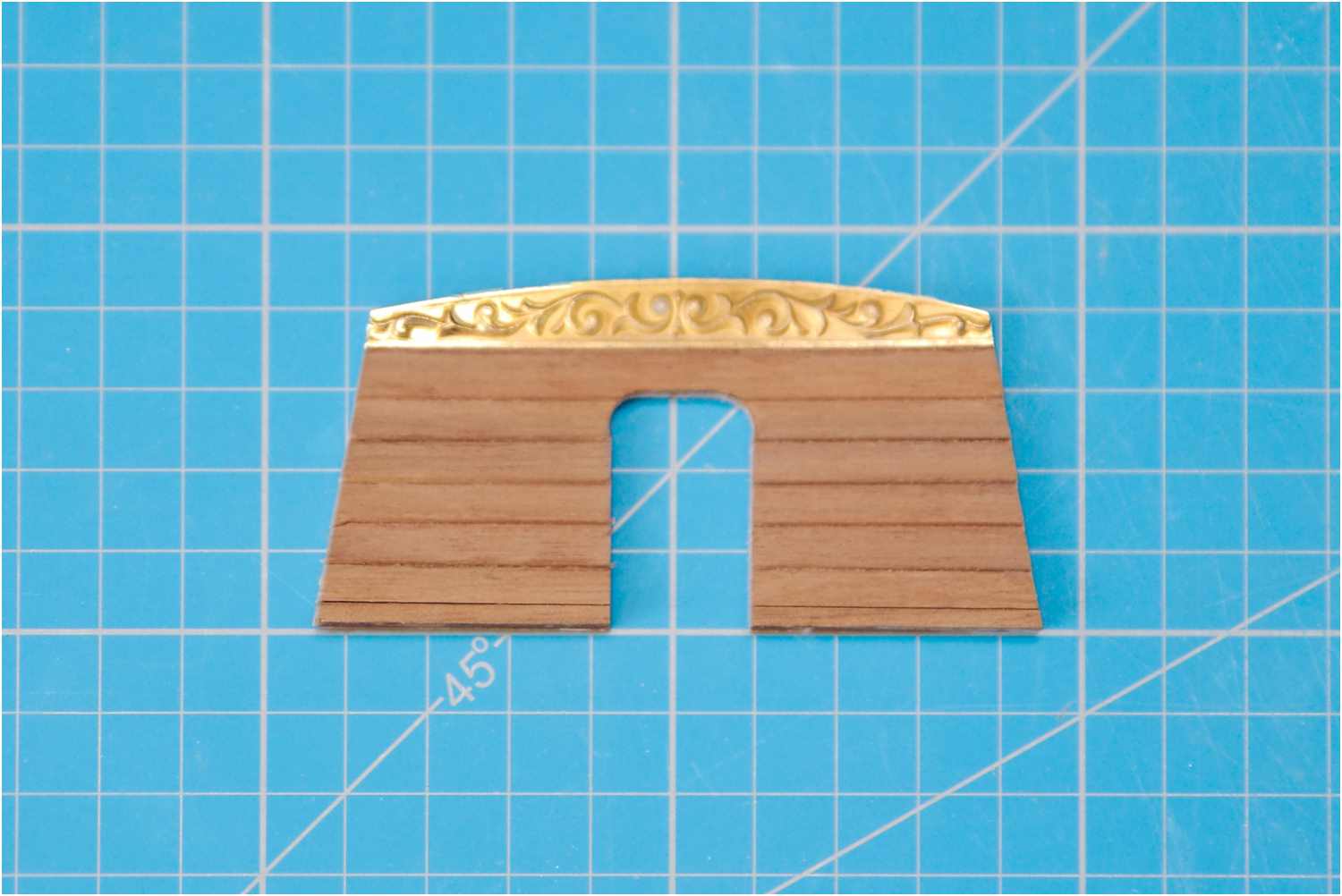 Für die Herstellung des Schotts unter der Kampanje wurde auf ein Stück Sperrholz erst eine 2 mm dicke Sockelleiste geklebt. Für die senkrechten Wandbretter habe ich 1 mm Nussbaum genommen um so einen kleinen Absatz erhalten.