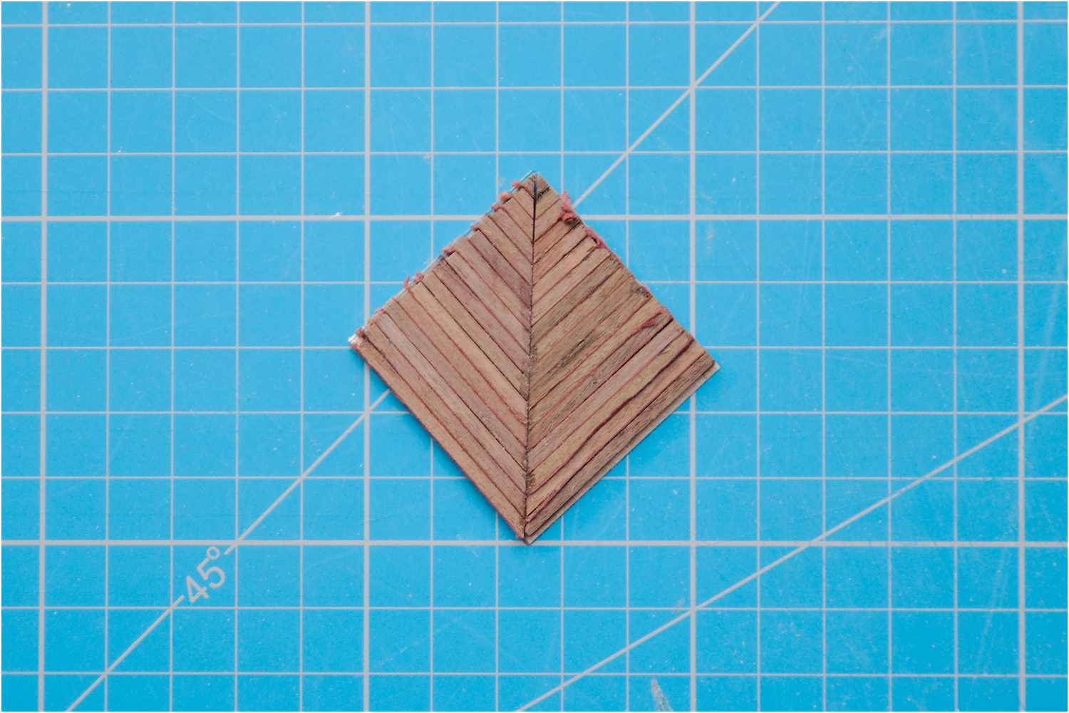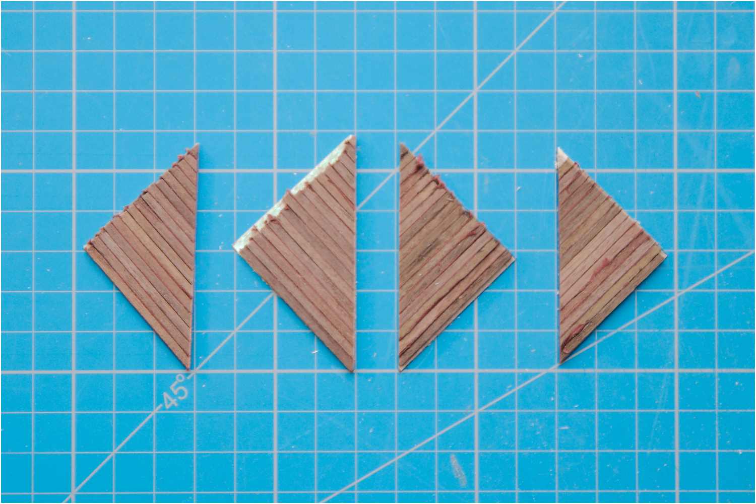 Deshalb habe ich kurzerhand zwei einzelne dünne Sperrholzplatten mit Leisten beklebt und diagonal durchgeschnitten, um anschließend zwei passende Teile wieder zusammenzukleben.