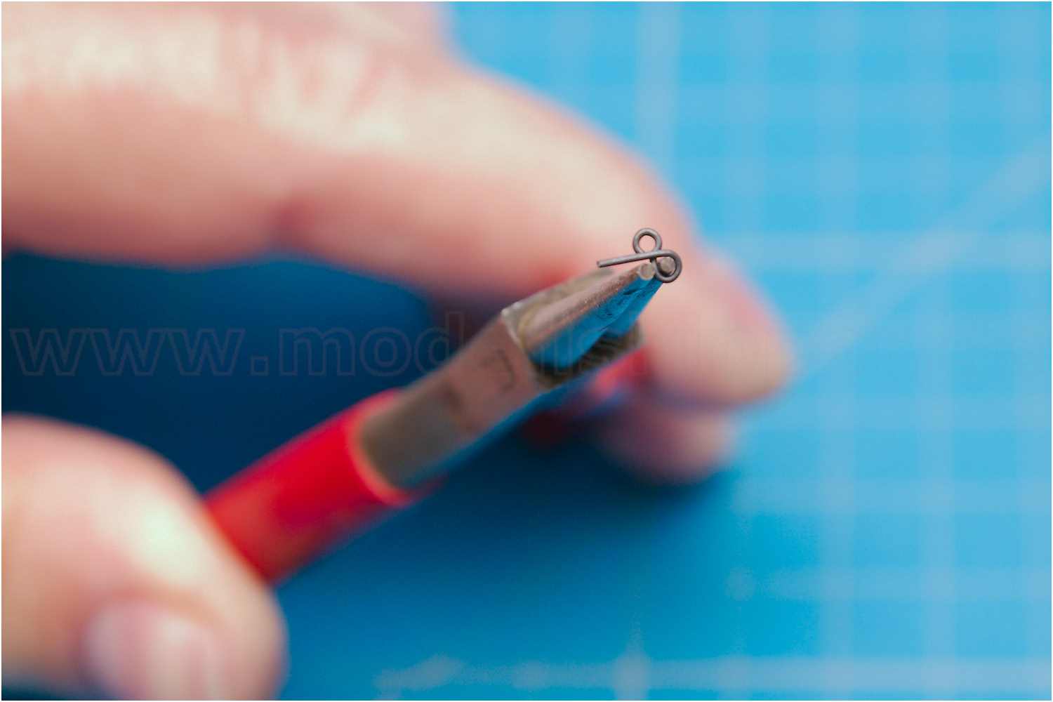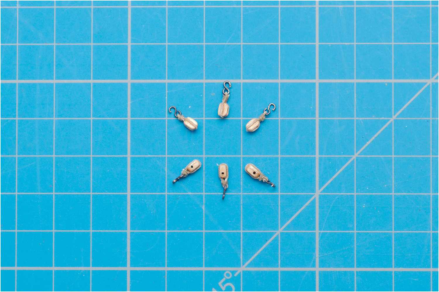 Um die Blöcke ist ein Stropp gelegt und ein Haken eingebunden. Die Haken habe ich aus 0,5 mm brüniertem Messingdraht gebogen.