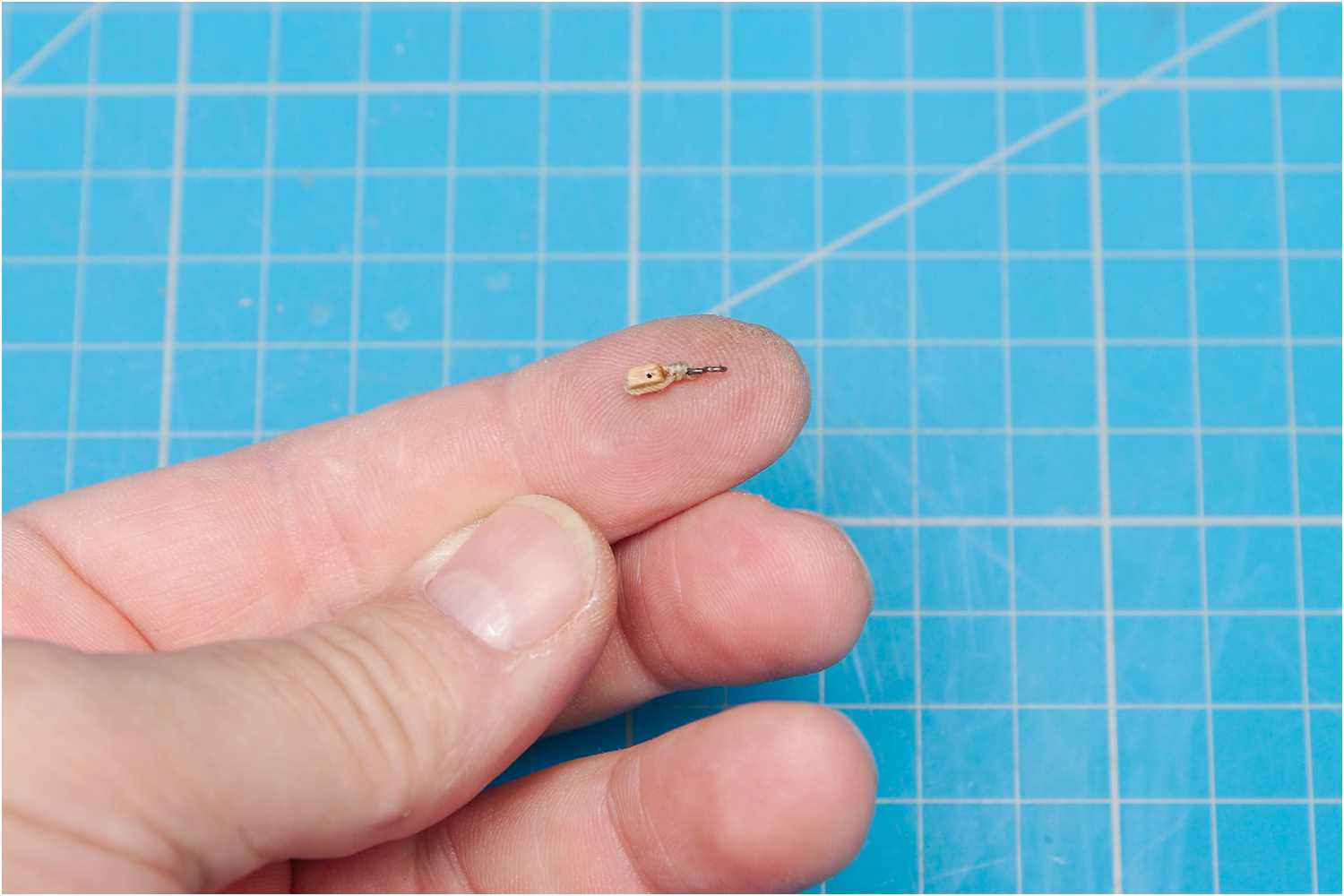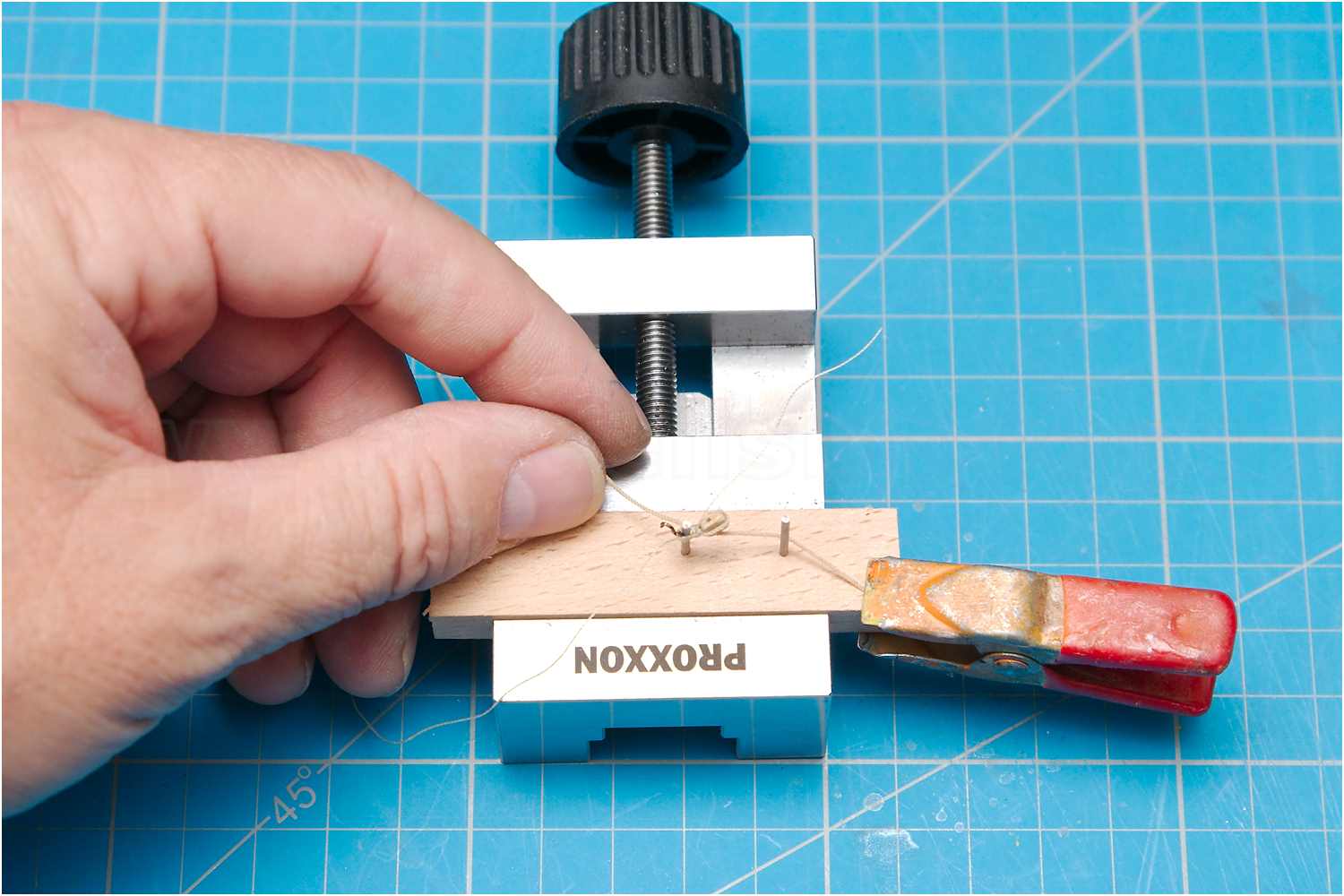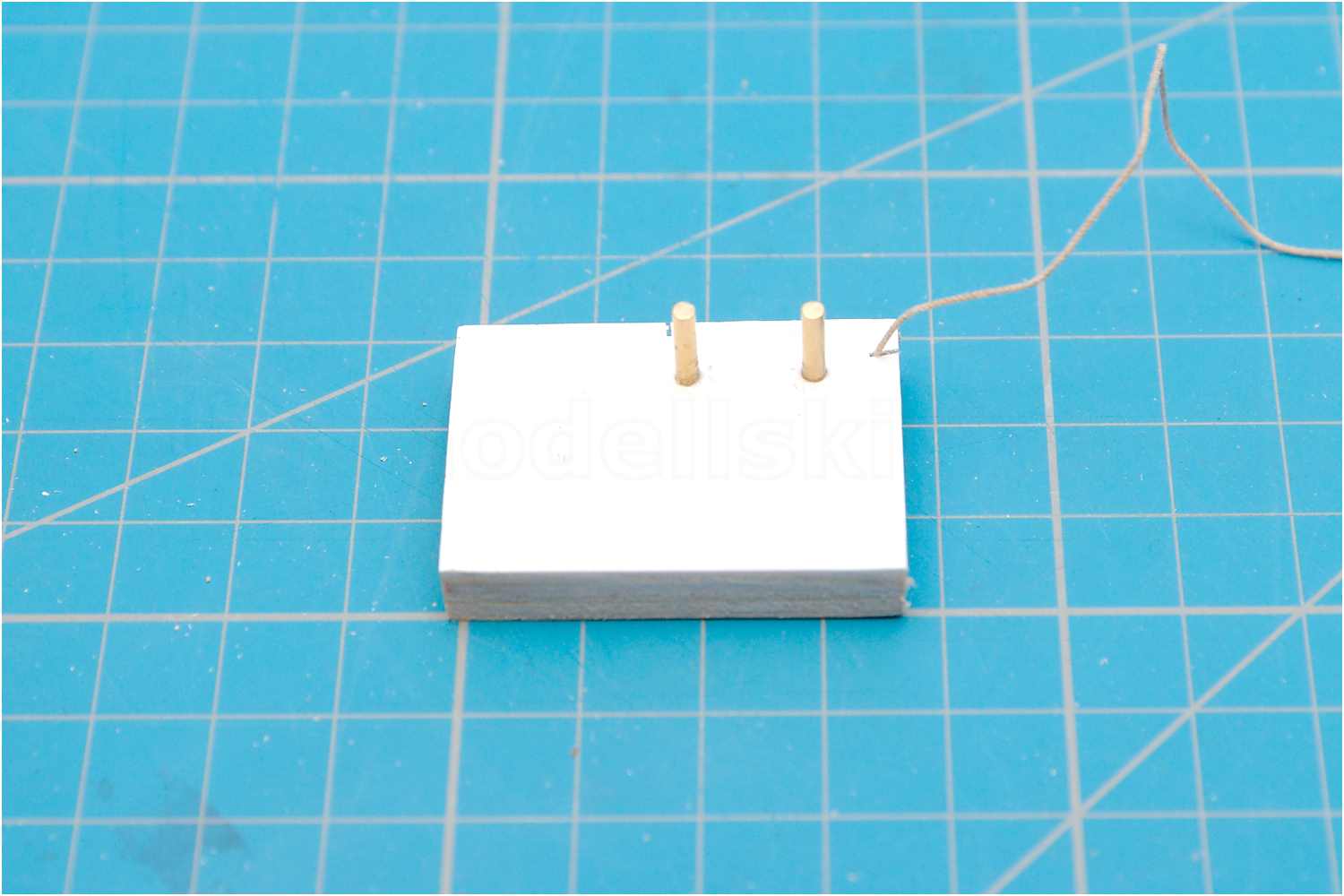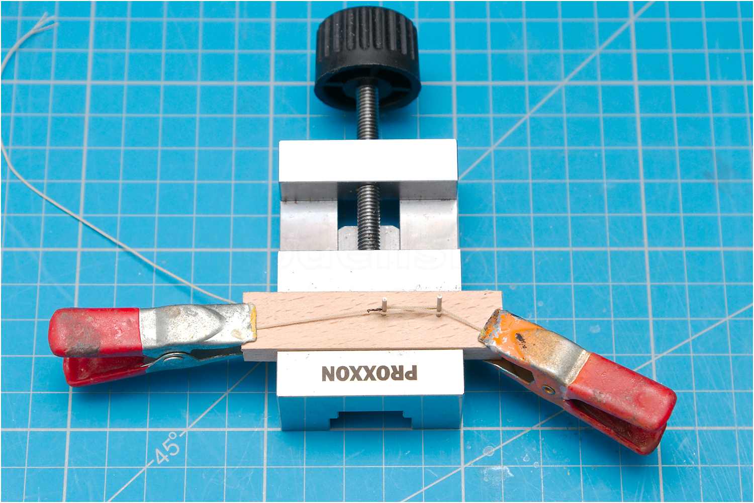 Hierfür habe ich ein Sperrholzrest mit Polystyrol beschichtet, in diese Platte zwei kurze Messingstifte eingeklebt und an der Stirnseite einen kleine Spalt eingesägt.