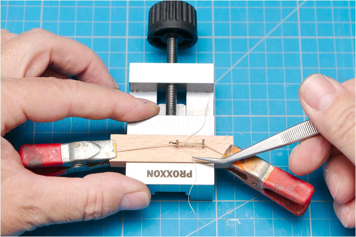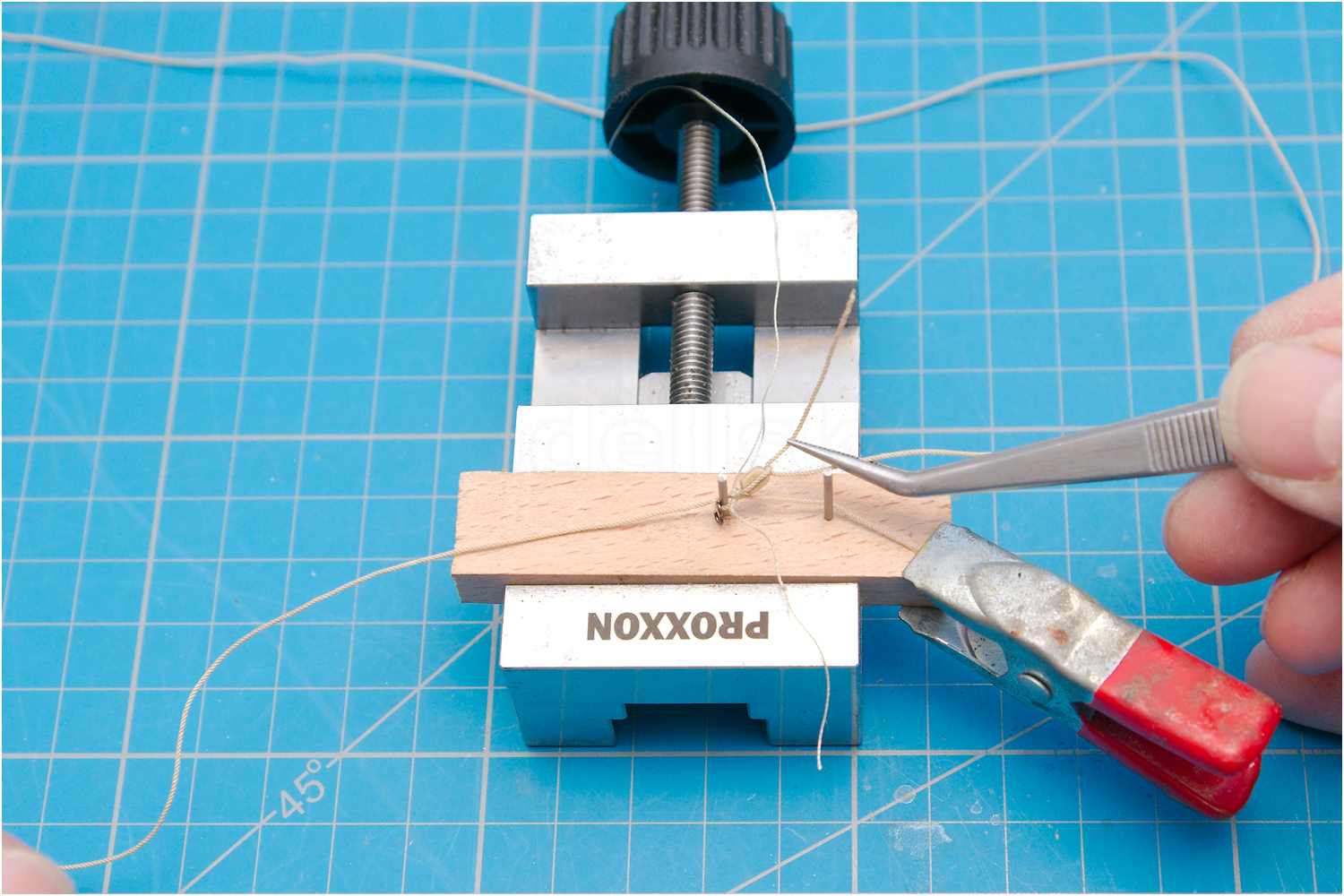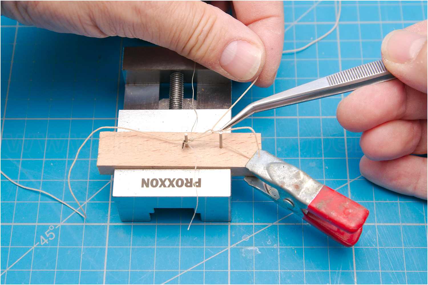 Dort klemme ich ein Ende das Taus ein, wickle es um die Messingstifte und tränke es mit Ballenmattierung.