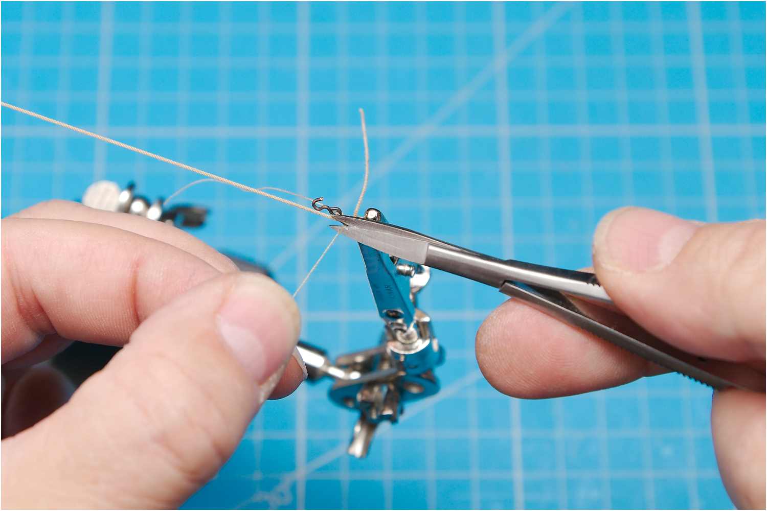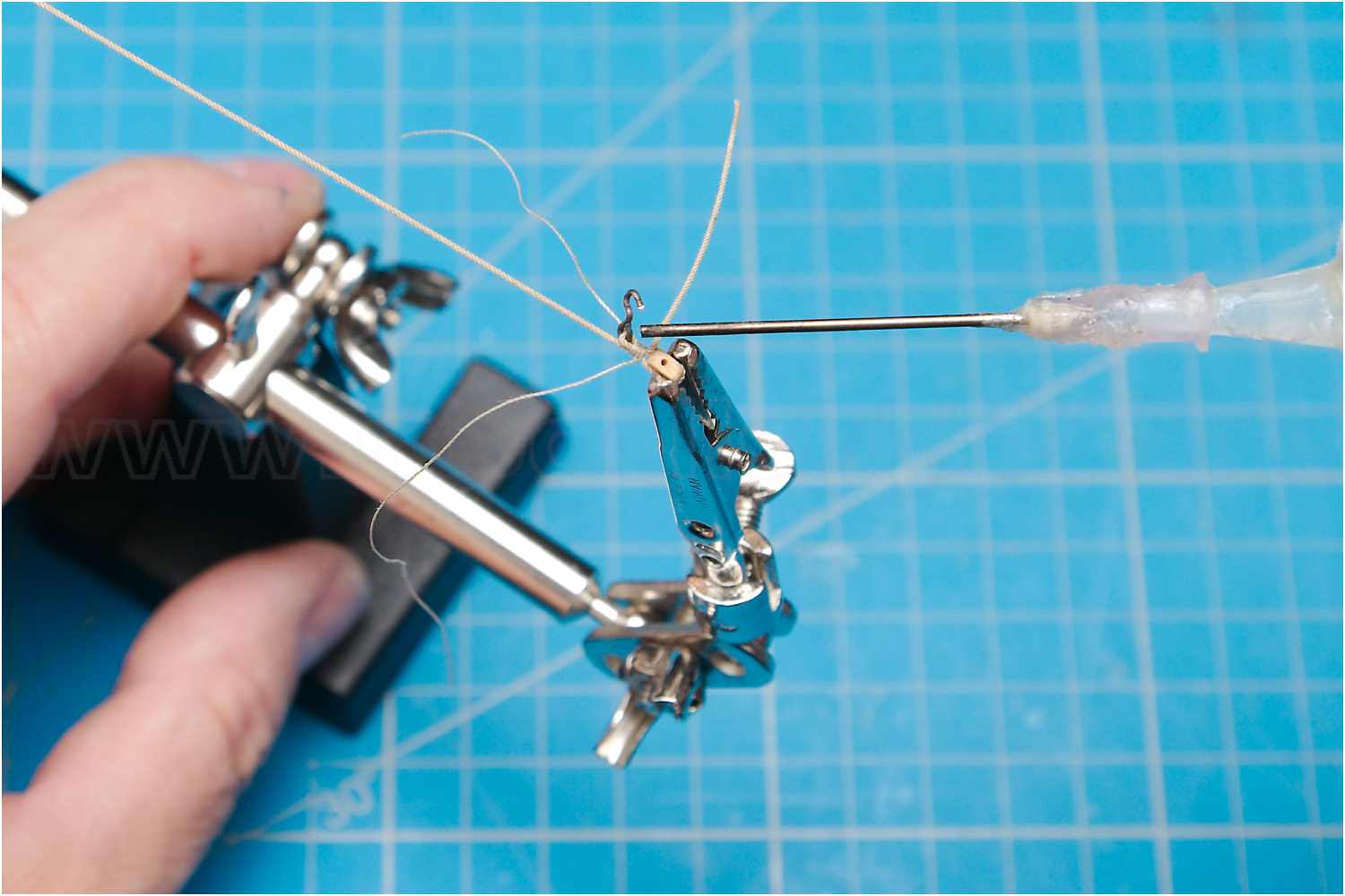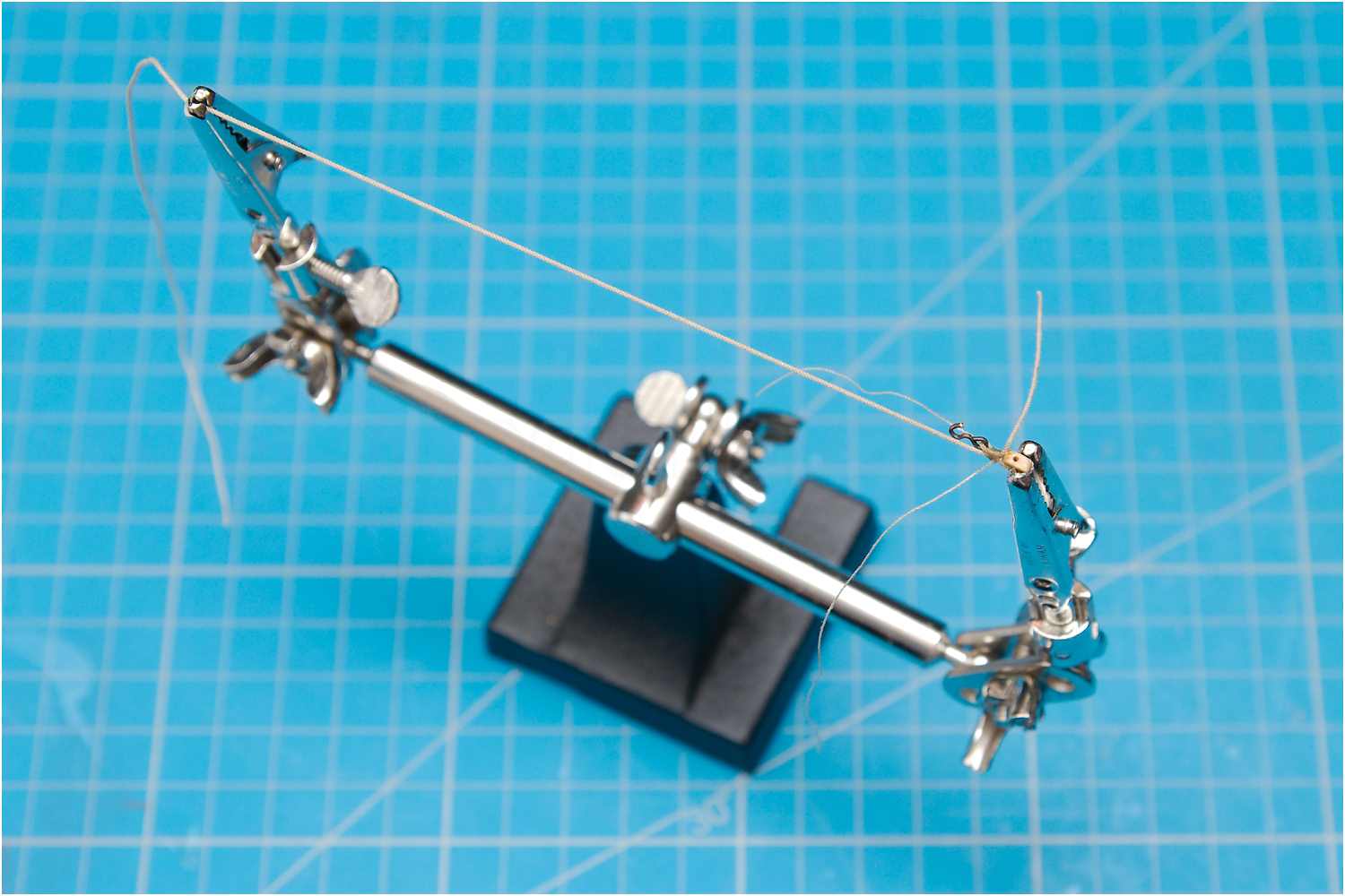 Mit Hilfe einer Dritten Hand spanne ich den getroppten Block ein, fixiere den Takling mit Sekundenkleber und kürze alle Fadenenden.