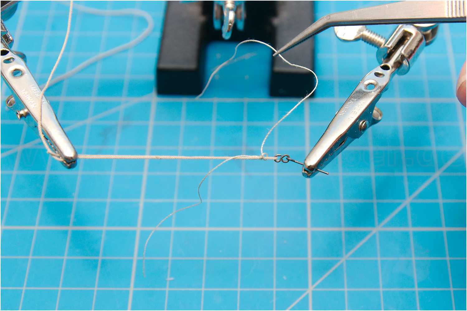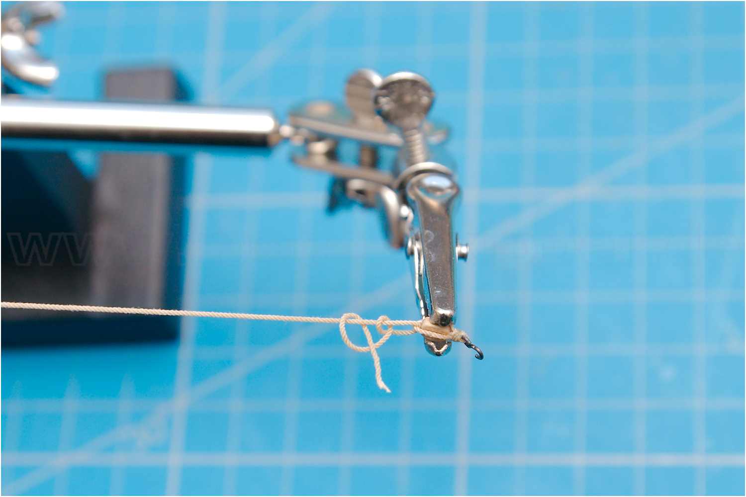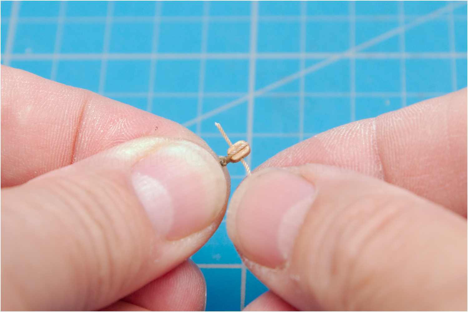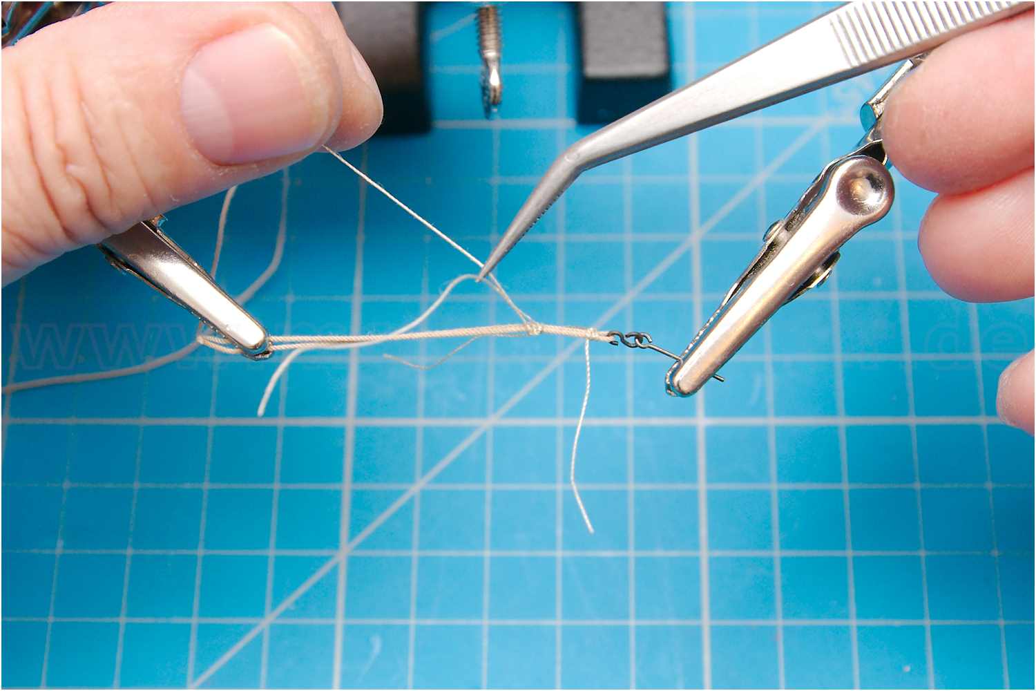 Mit 0,1 mm Garn wird nun auf das Reep ein Takling gesetzt. So erhalte ich zwei Schlaufen, eine für den Haken und die andere für den Block. Mit den Enden des Seils kann ich die Schlaufen zusammenziehen. Um identische Taklinge zu erhalten, habe ich diese immer mit 5 Schlägen gebunden.