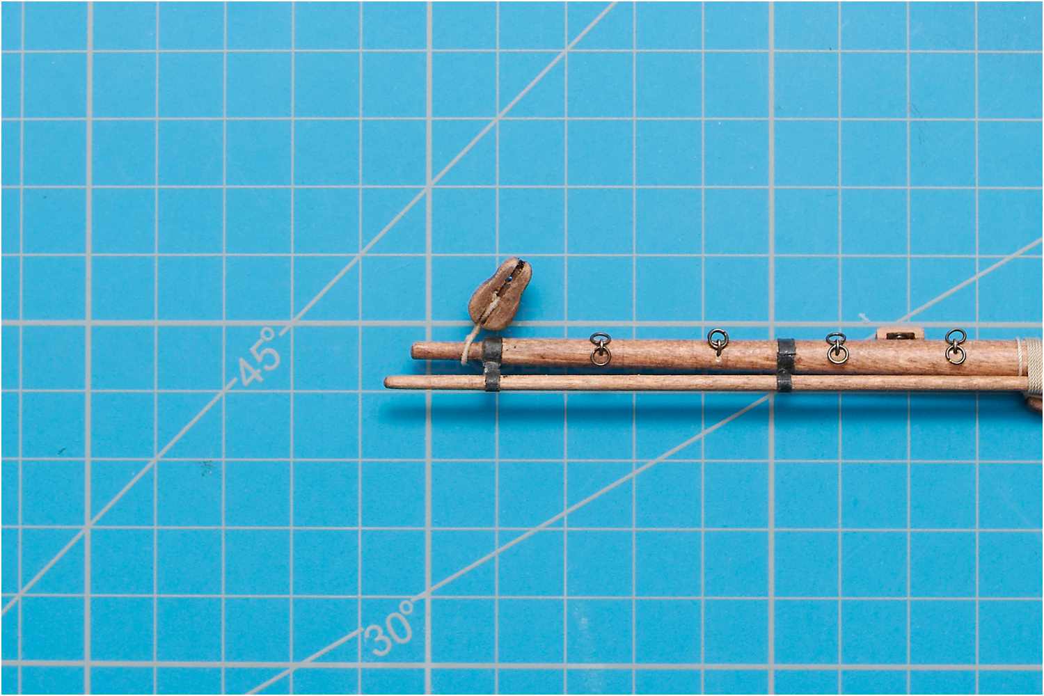 Für das laufende Gut nutze ich Garn der Fa. Gütermann vom Typ Mara, Skala oder Tera mit den unterschiedlichsten Fadenstärken von 30 bis 420, um entsprechend flexibel die notwendigen Taudurchmesser schlagen zu können. Ein Übersicht der Taue, die mit diesen Garnen geschlagen werden können, findet man hier.