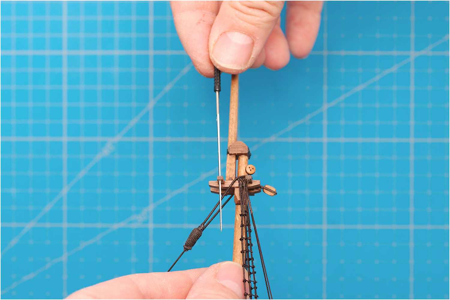 Ich hatte die Löcher zwar schon beim Zusammenbau gebohrt, musste sie aber noch ein wenig erweitern. Etwas eng für einen Handbohrer, passe ich die Bohrungen in den Salingen noch einmal mit einer Reibahle an, sodass ich den Stropp der unteren Juffer vollkommen versenken kann und diese direkt auf der Saling aufliegt.