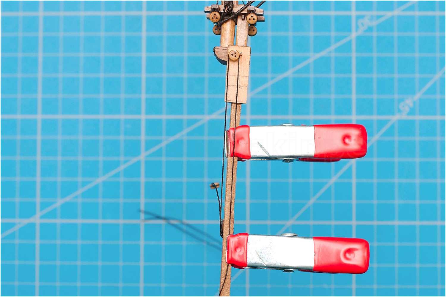 Die Wantjuffern habe ich, wie schon bei den Marsstengen, wieder mit einer Abstandsleiste eingebunden und später mit einem Taljereep steifgesetzt.