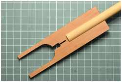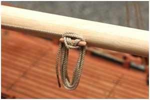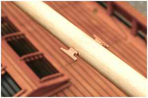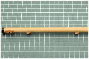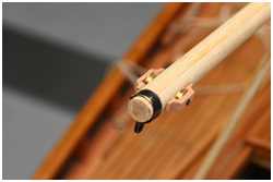 Für den Halt am Mast hat auch die Gaffel eine Korallenleine erhalten und als Letztes wurden die sog. Knaggen angeleimt. Diese kleinen Holzklötze halten später das Piekfall der Gaffel in Position.