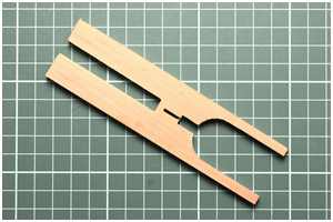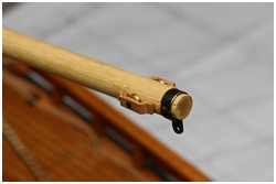 Die Gaffel ist ebenfalls, wie alle anderen Hölzer, hohl verklebt und wurde ohne Maschinenunterstützung komplett per Hand gehobelt und anschließend mit Schmirgelleinen geschliffen.