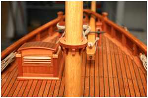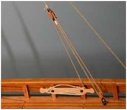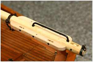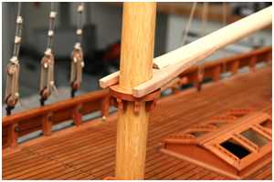 Ich habe ihn mit Absicht nicht verklebt, denn sollte später mal einer der hölzernen Mastringe brechen, kann den Messingstift wieder rausdrücken und den Sattel ohne größere Probleme entfernen.