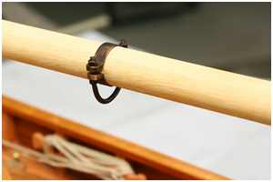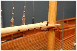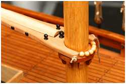 Die Klau wurde verbolzt, es wurden Augbolzen für den Halsstropp des Segels und die vorderen Reffleinen angebracht. Die auf eine Leine aufgefädelten Holzkugeln, sog. Korallen, halten den Baum am Mast.