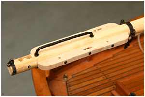 Um den Sattel am Mast zu befestigten, wurde der Holzring und Mast komplett quer durchbohrt, ein Messingstift eingesteckt und die Löcher mit Holzdübeln verschlossen.