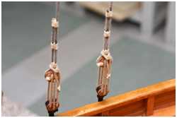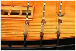 Die bekleideten Wanten sind gut zu erkennen und passen prima ins Ambiente. Das Tau für das Taljereep habe ich wieder nach Maß auf meiner Reepmaschine selbst geschlagen.