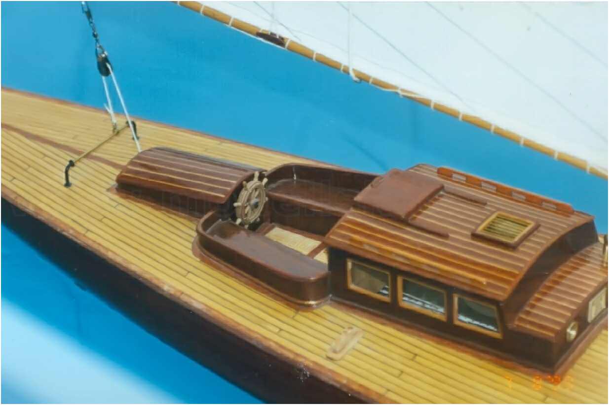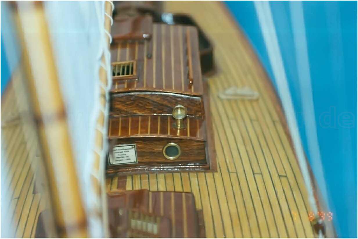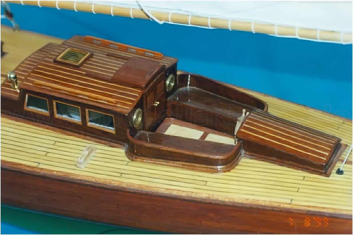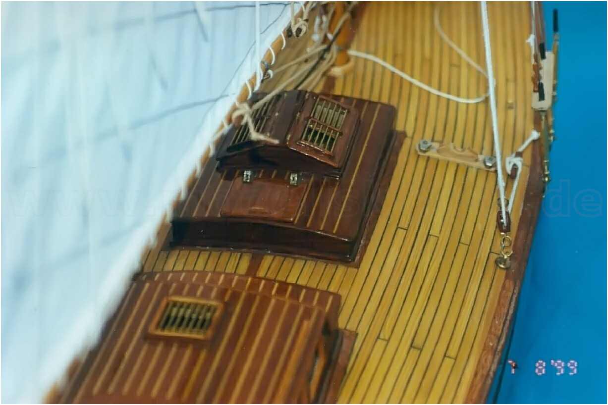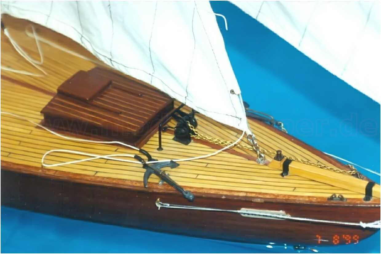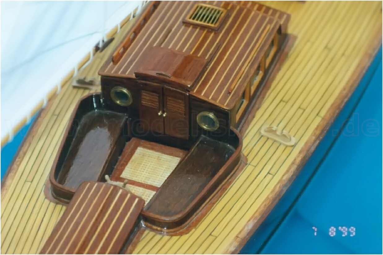 Der GFK-Rumpf des Modells ist bis zur Wasserlinie mit Mahagoni beplankt und wie auch die Aufbauten mit einer hochglänzenden G-4-Lackierung überzogen. Dieser Lack ist zwar teuer (140 DM/Liter), aber dafür sehr strapazierfähig und seewasserfest. Allein die Lackierung des Rumpfes hat sich über mehrere Wochen hingezogen. 10-mal wurde er lackiert und wieder abgeschliffen. Das Deck ist original kalfatert und matt gehalten.