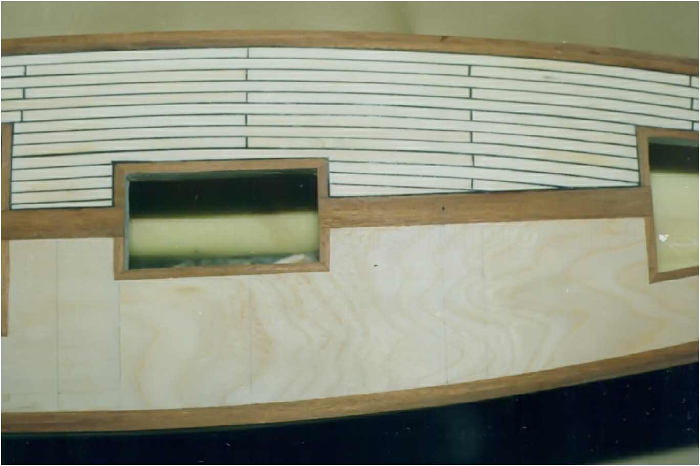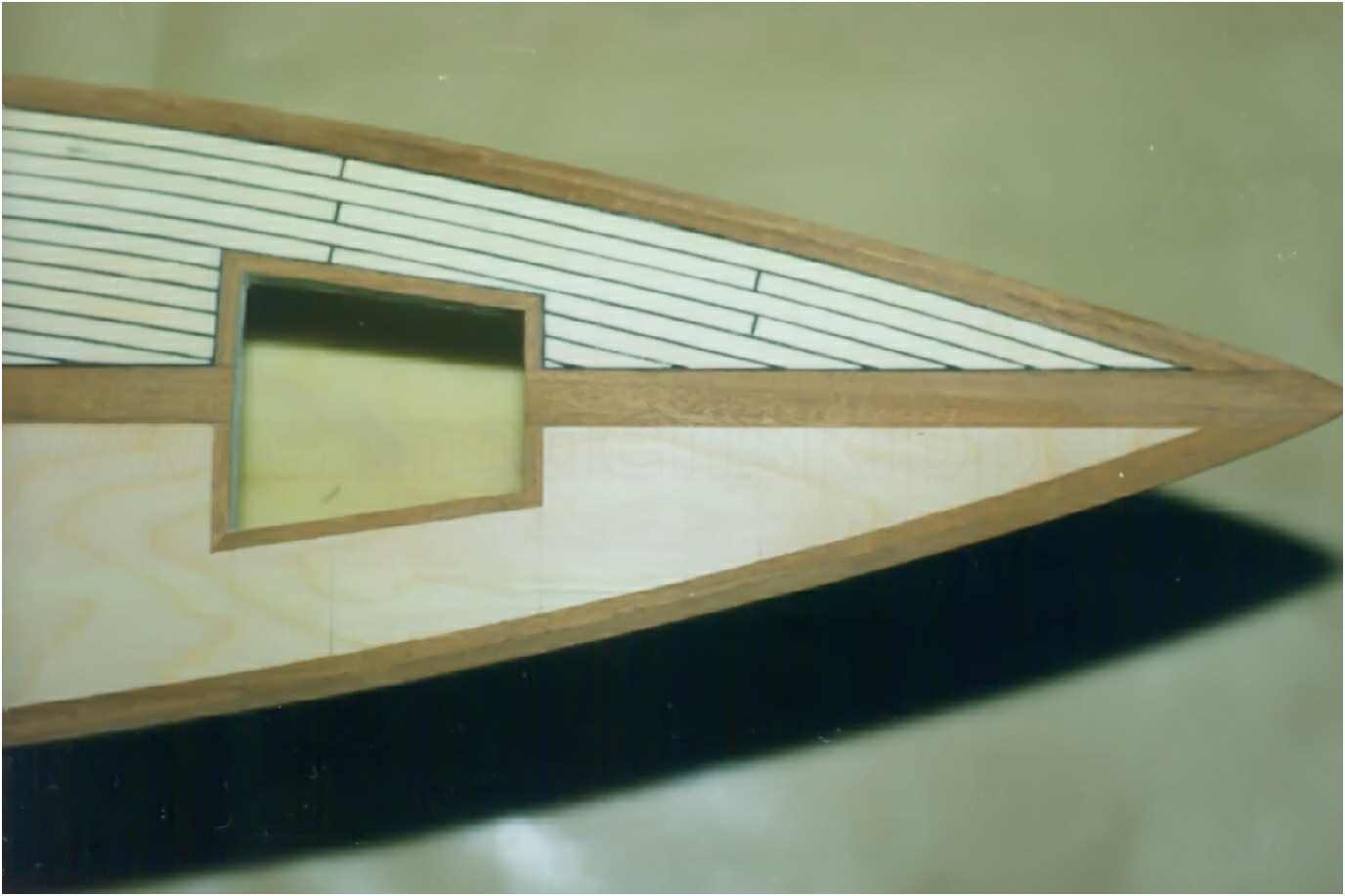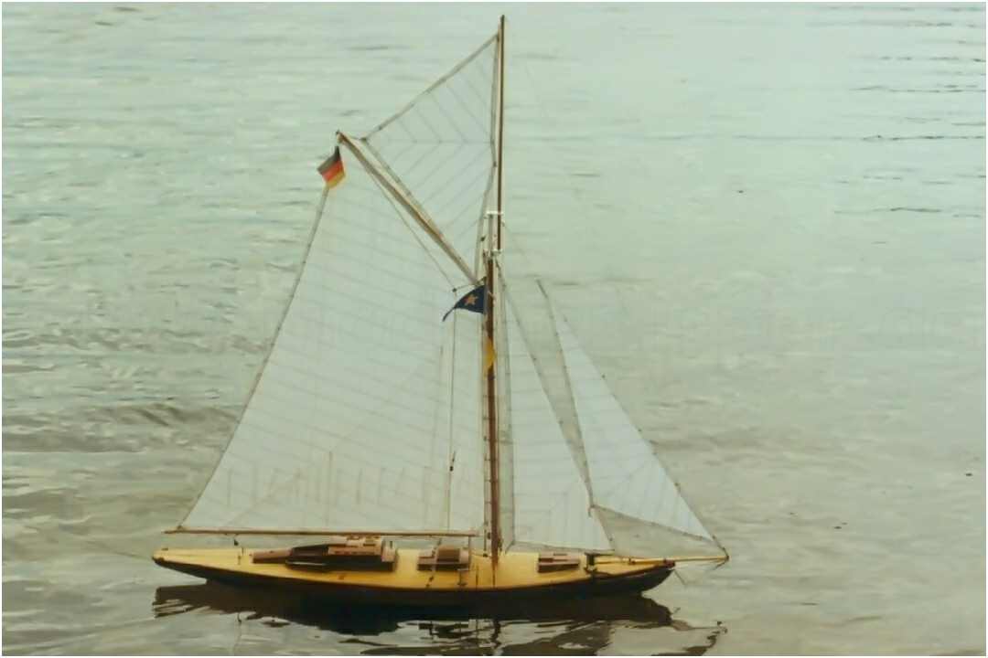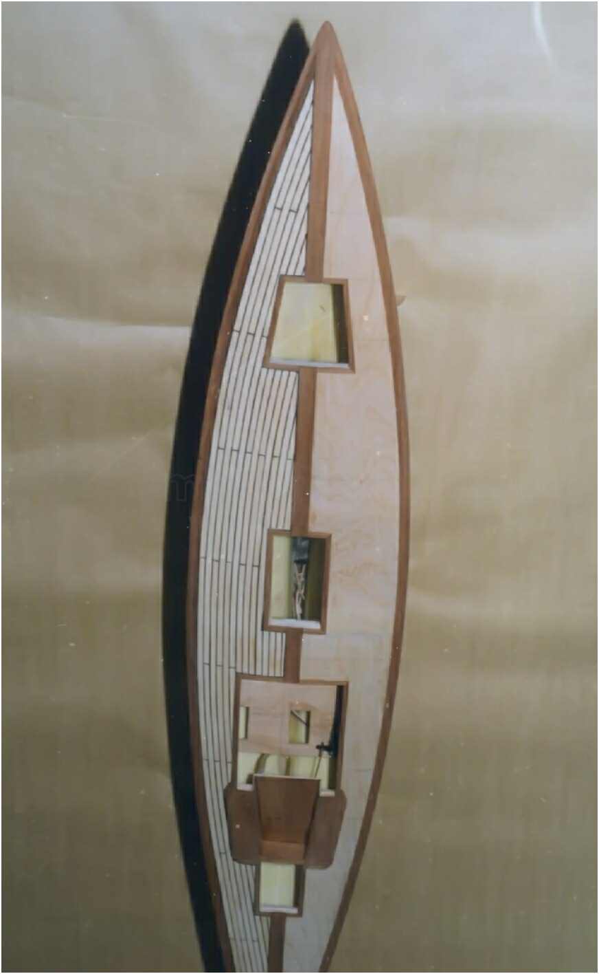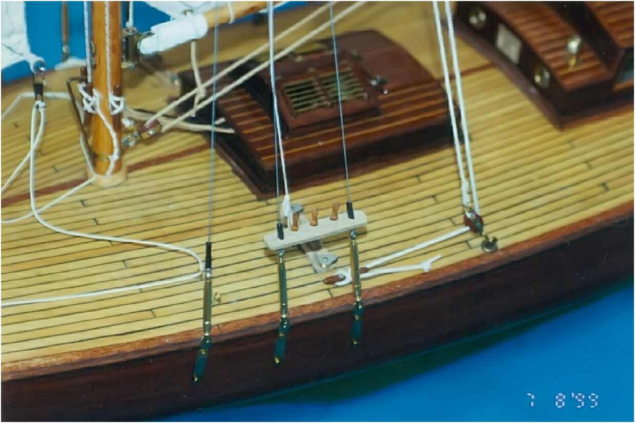 Der GFK-Rumpf des Modells ist bis zur Wasserlinie mit Mahagoni beplankt und wie auch die Aufbauten mit einer hochglänzenden G-4-Lackierung überzogen. Dieser Lack ist zwar teuer (140 DM/Liter), aber dafür sehr strapazierfähig und seewasserfest. Allein die Lackierung des Rumpfes hat sich über mehrere Wochen hingezogen. 10-mal wurde er lackiert und wieder abgeschliffen. Das Deck ist original kalfatert und matt gehalten.