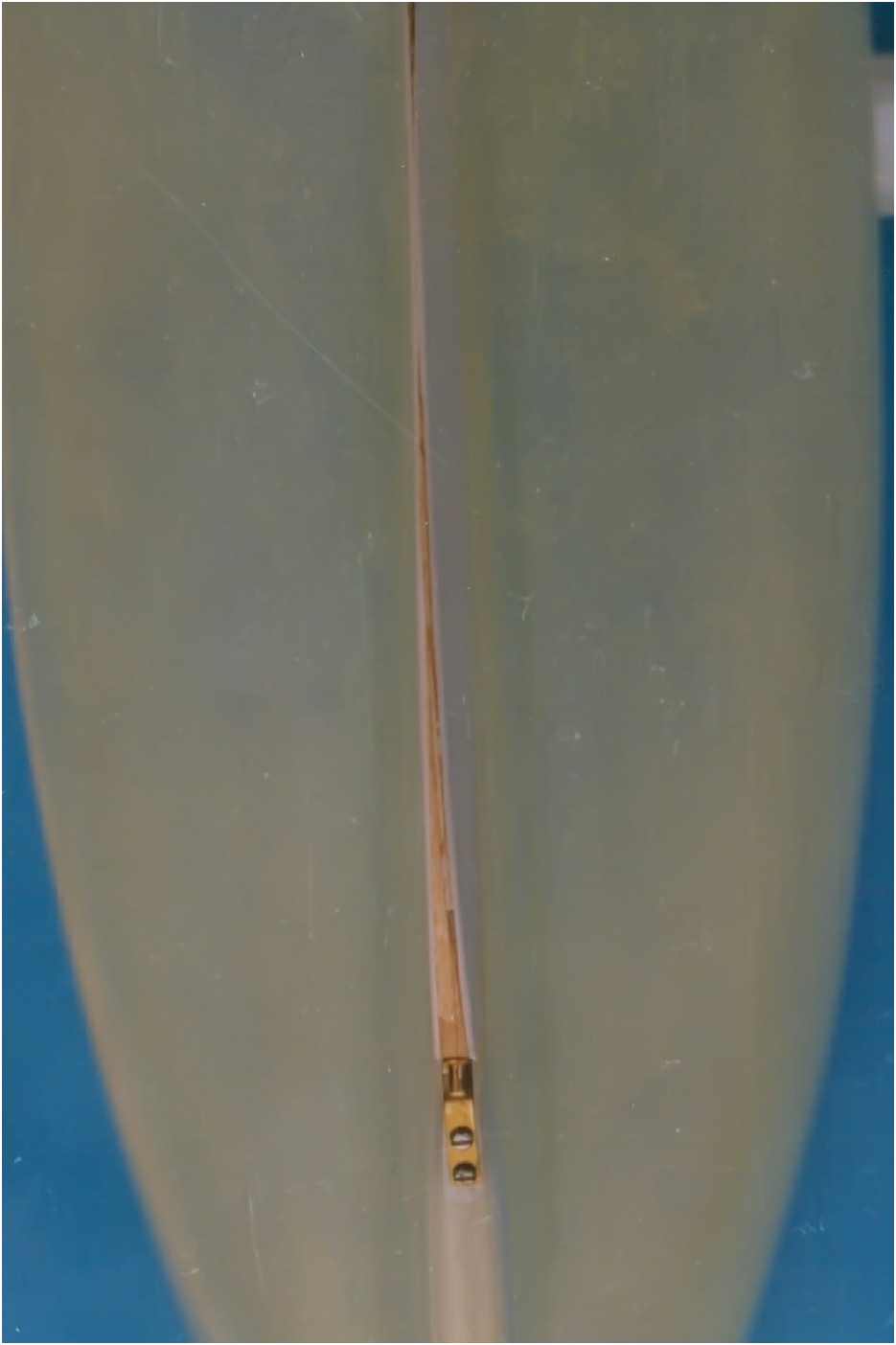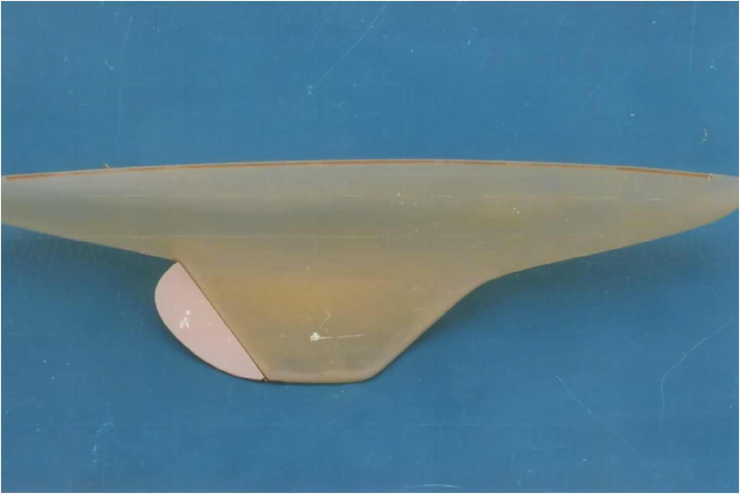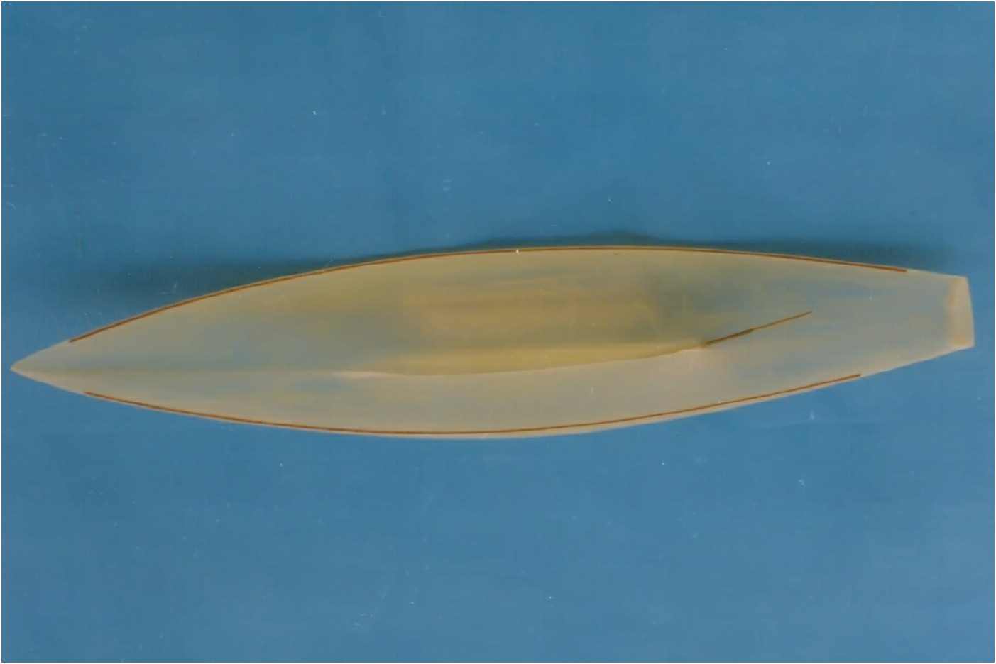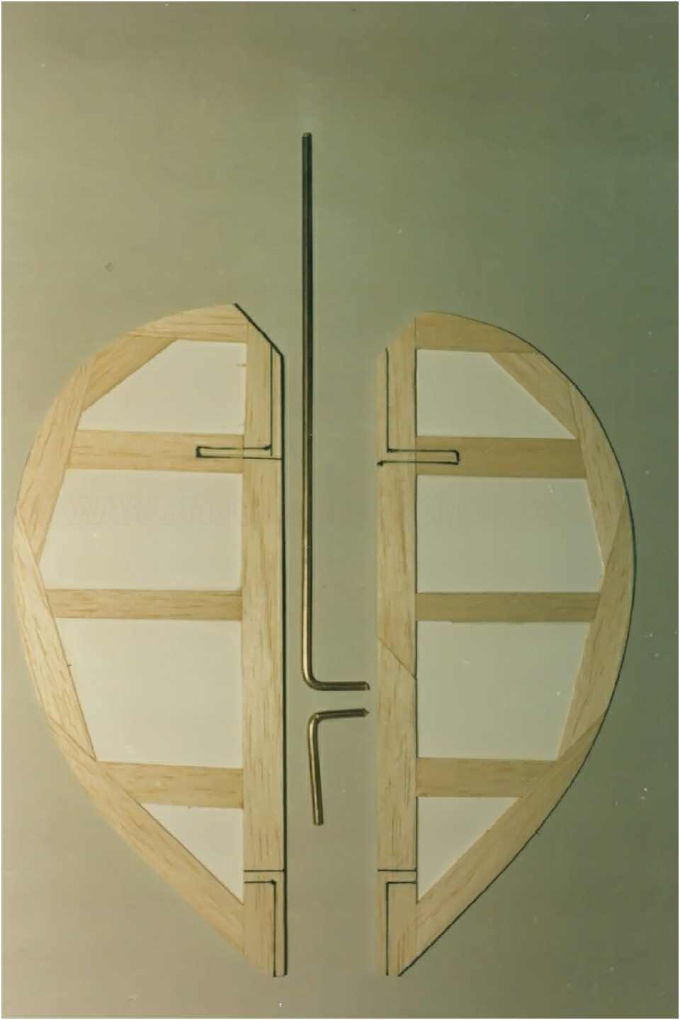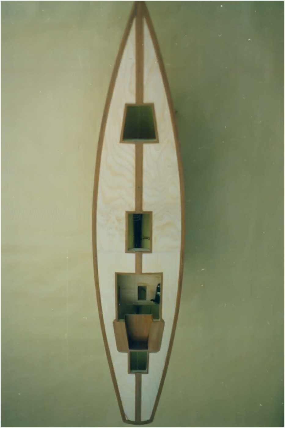 Der GFK-Rumpf des Modells ist bis zur Wasserlinie mit Mahagoni beplankt und wie auch die Aufbauten mit einer hochglänzenden G-4-Lackierung überzogen. Dieser Lack ist zwar teuer (140 DM/Liter), aber dafür sehr strapazierfähig und seewasserfest. Allein die Lackierung des Rumpfes hat sich über mehrere Wochen hingezogen. 10-mal wurde er lackiert und wieder abgeschliffen. Das Deck ist original kalfatert und matt gehalten.