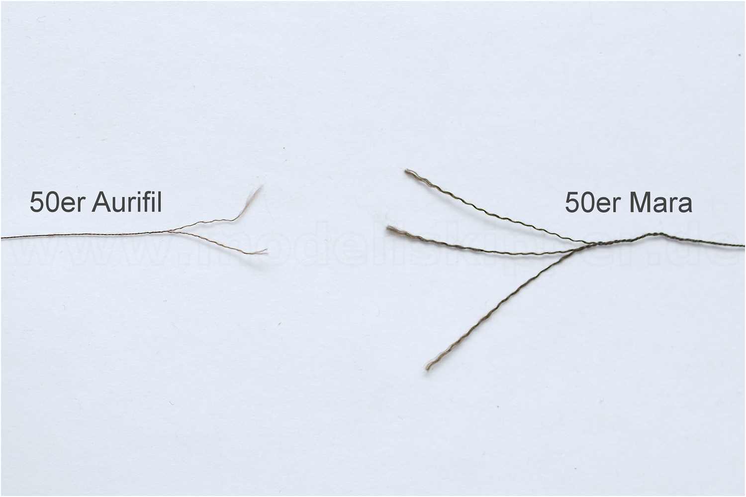 Jedoch ist eine wesentlich kleinere Auswahl an Garnstärken am Markt verfügbar. So sind zwar auch recht dicke Garne in den Stärken von 12 und 28 zu finden, für die Zwecke der Herstellung von Modelltauen beschränkt sich die Auswahl jedoch nur auf 40er, 50er und 80er Stärken.