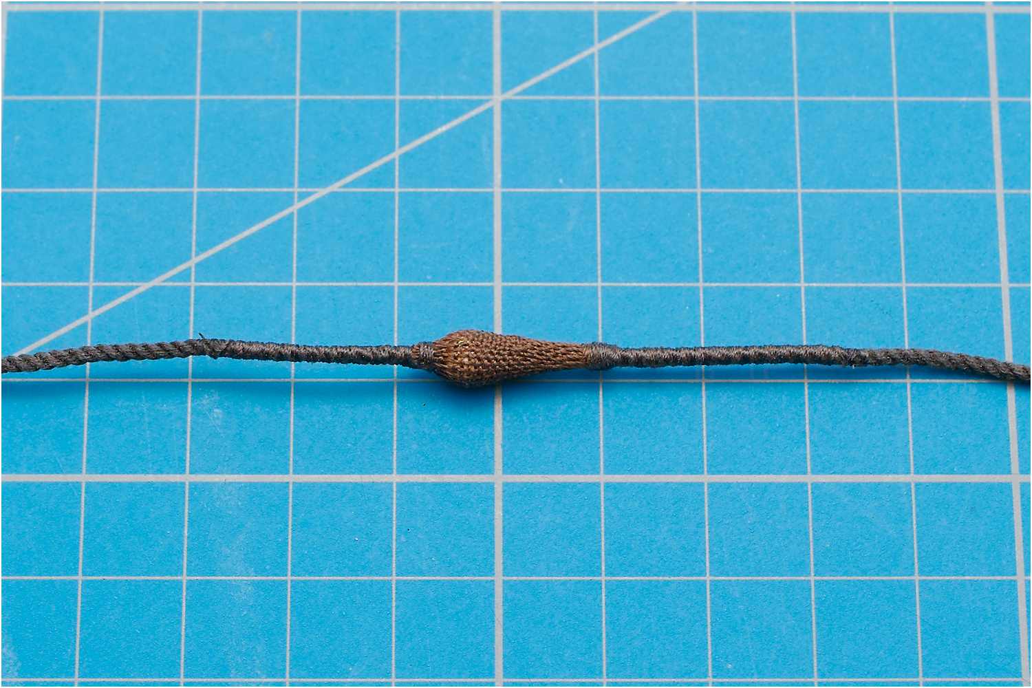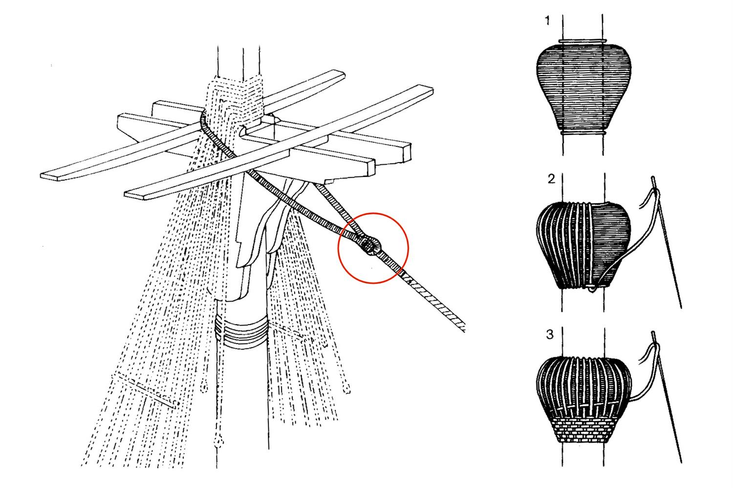 Die Technik zur Herstellung des Flechtings ähnelt dem Stopfen eines Lochs, bei dem rund um die Verdickung mehrere Kettfäden mit einem einzelnen Schussfaden verflochten werden.