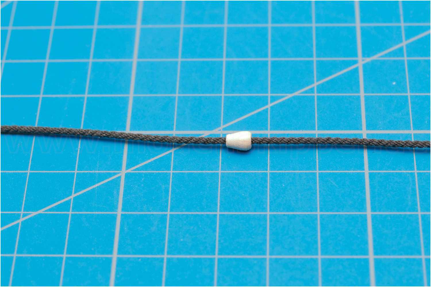 Ein kleines in Form einer Birne geschliffenes und durchbohrtes Rundholz als Grundkörper der späteren Stagmaus verklebe ich auf dem Stag, fädle dieses durch die aufgebohrten Schrauben und belege es an den beiden Klampen.