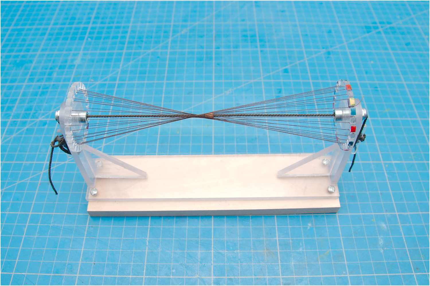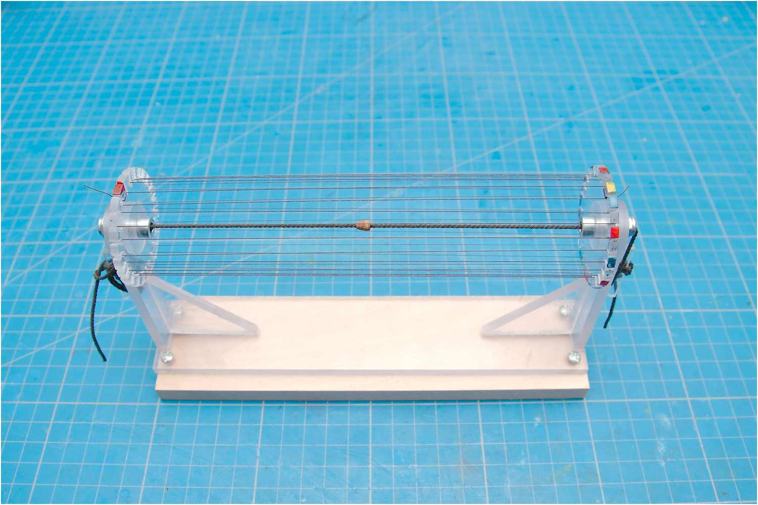 Nach den ersten Versuchen hat sich herausgestellt, dass sich hierbei die seitlichen Stützen durch die Spannung der Fäden verbiegen, sodass ich als Verstärkung noch zwei Plexiglaswinkel angeklebt habe.