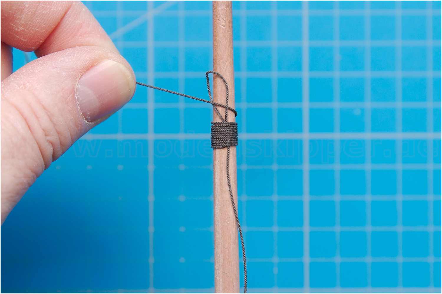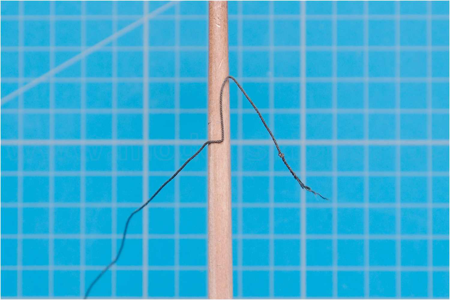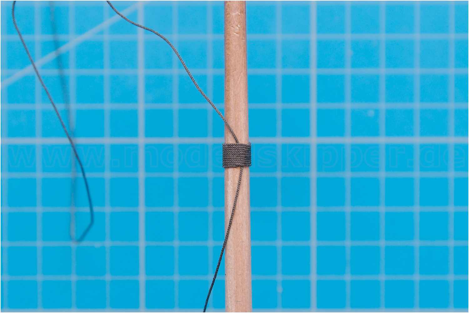 Einen Wuling anzufertigen ist schnell erledigt. Zuerst legt man mit dem kurzen Ende eine Schlaufe, fixiert am Anfang des Wulings das Tau mit einem winzigen Tropfen Sekundenkleber und umwickelt die Schlaufe mit dem langen Ende. Bei der Anzahl der Wicklungen richtet man sich nach dem jeweiligen Rundholz, sodass die Länge des Wulings dem Durchmesser des Masts entspricht.