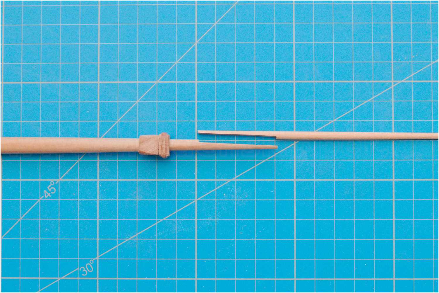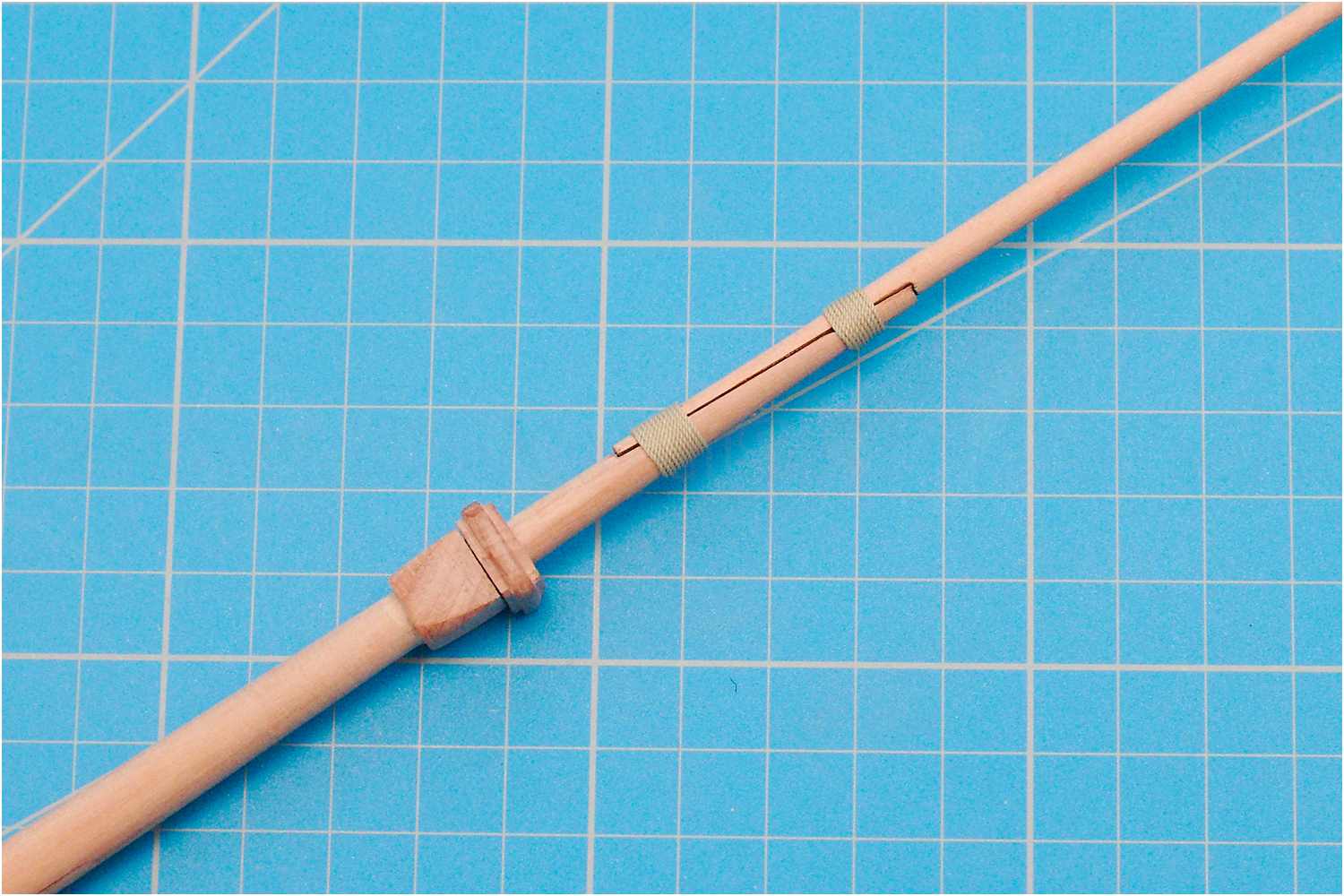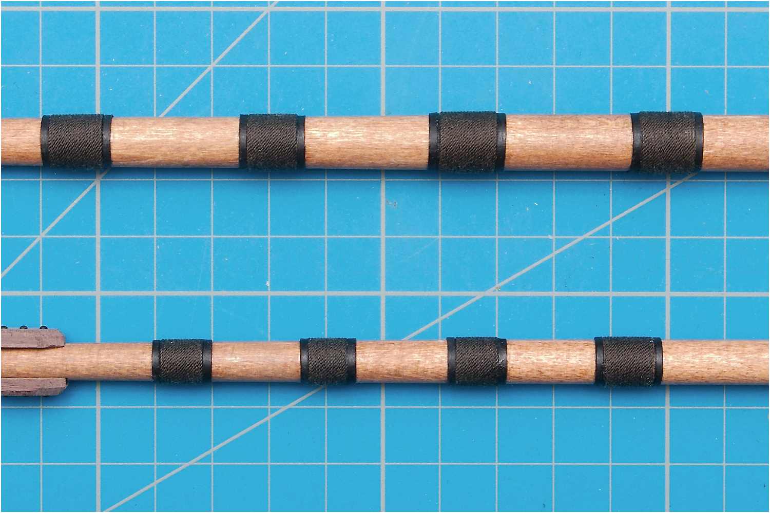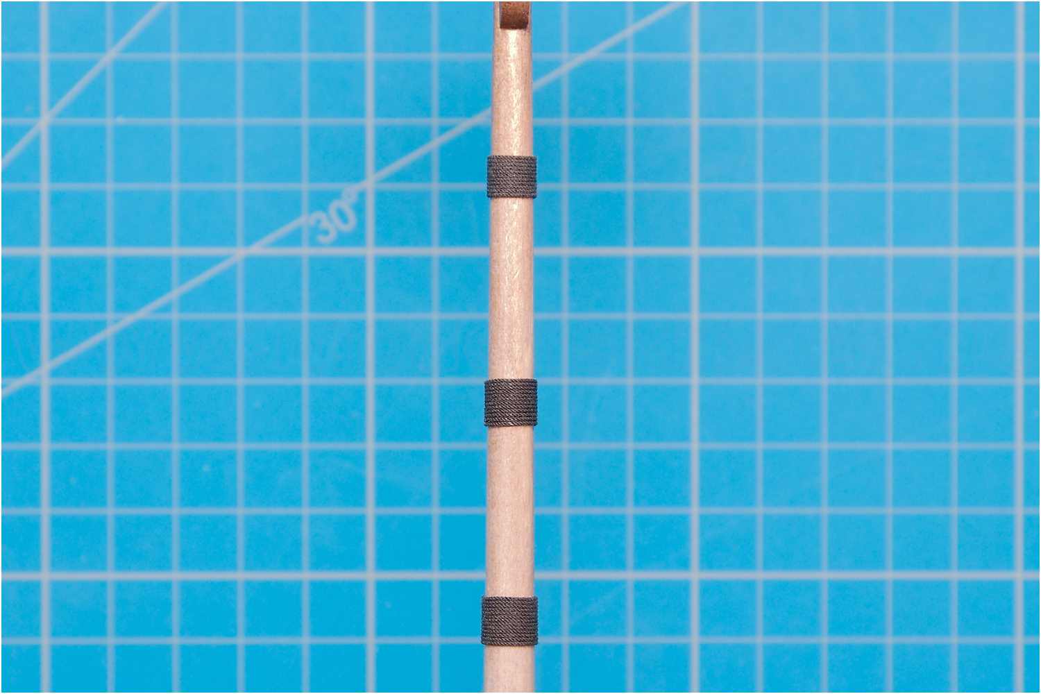 Einen Wuling anzufertigen ist schnell erledigt. Zuerst legt man mit dem kurzen Ende eine Schlaufe, fixiert am Anfang des Wulings das Tau mit einem winzigen Tropfen Sekundenkleber und umwickelt die Schlaufe mit dem langen Ende. Bei der Anzahl der Wicklungen richtet man sich nach dem jeweiligen Rundholz, sodass die Länge des Wulings dem Durchmesser des Masts entspricht.