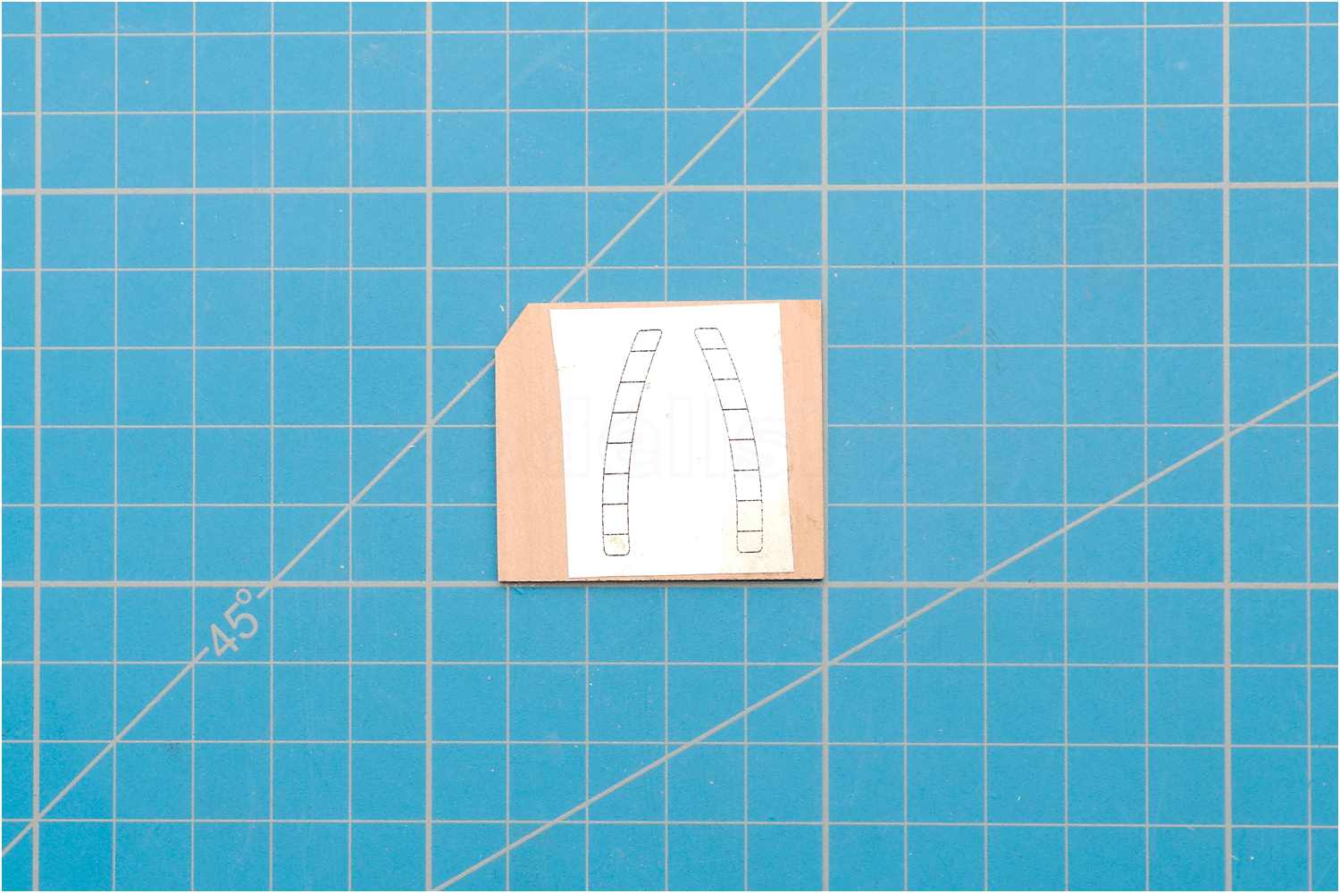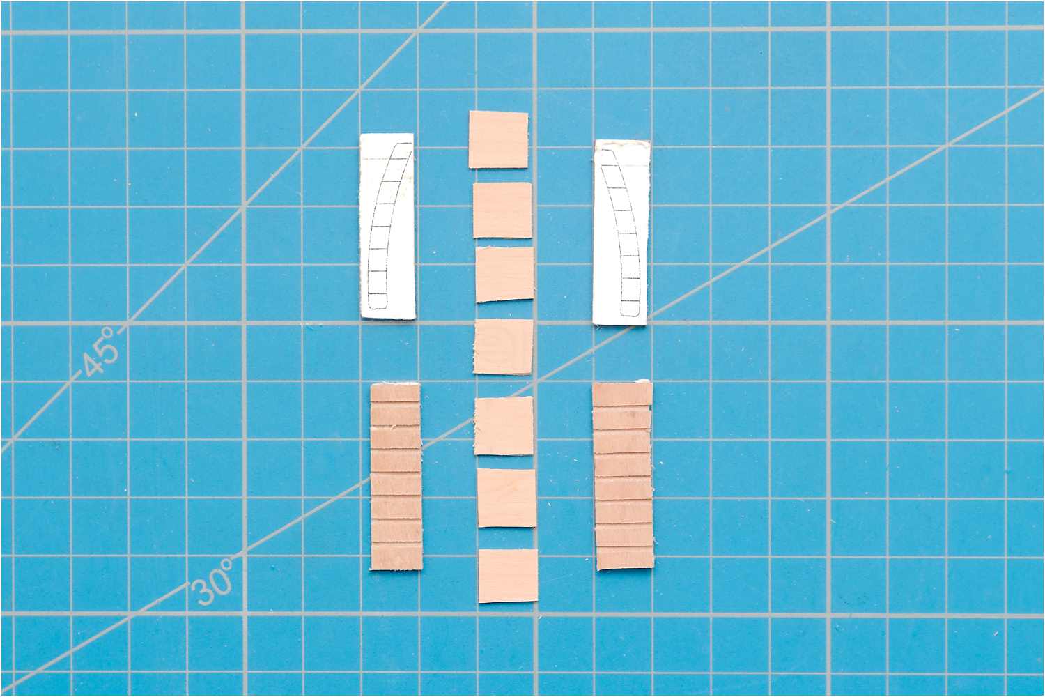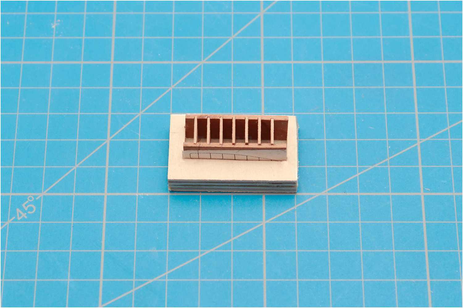 Eine entsprechende Schablone klebe ich auf ein Holzbrettchen, fräse die Fugen für die Treppenstufen und schneide die Stufen aus einer Furnierleiste zu.