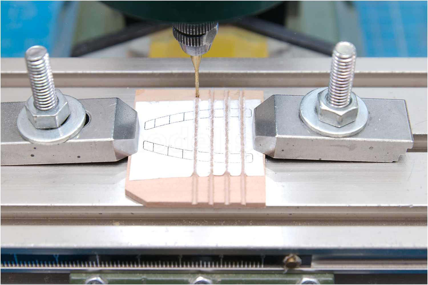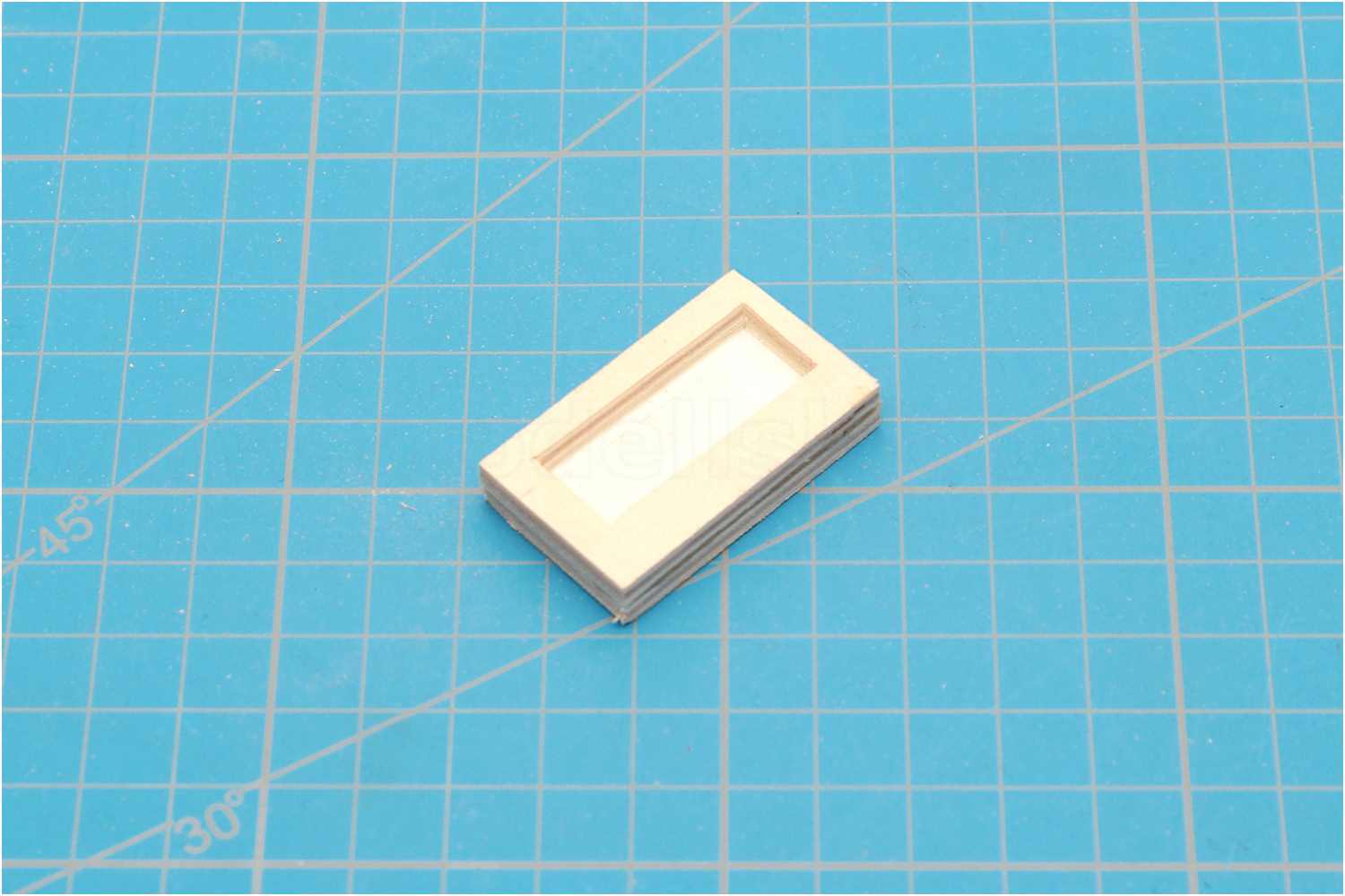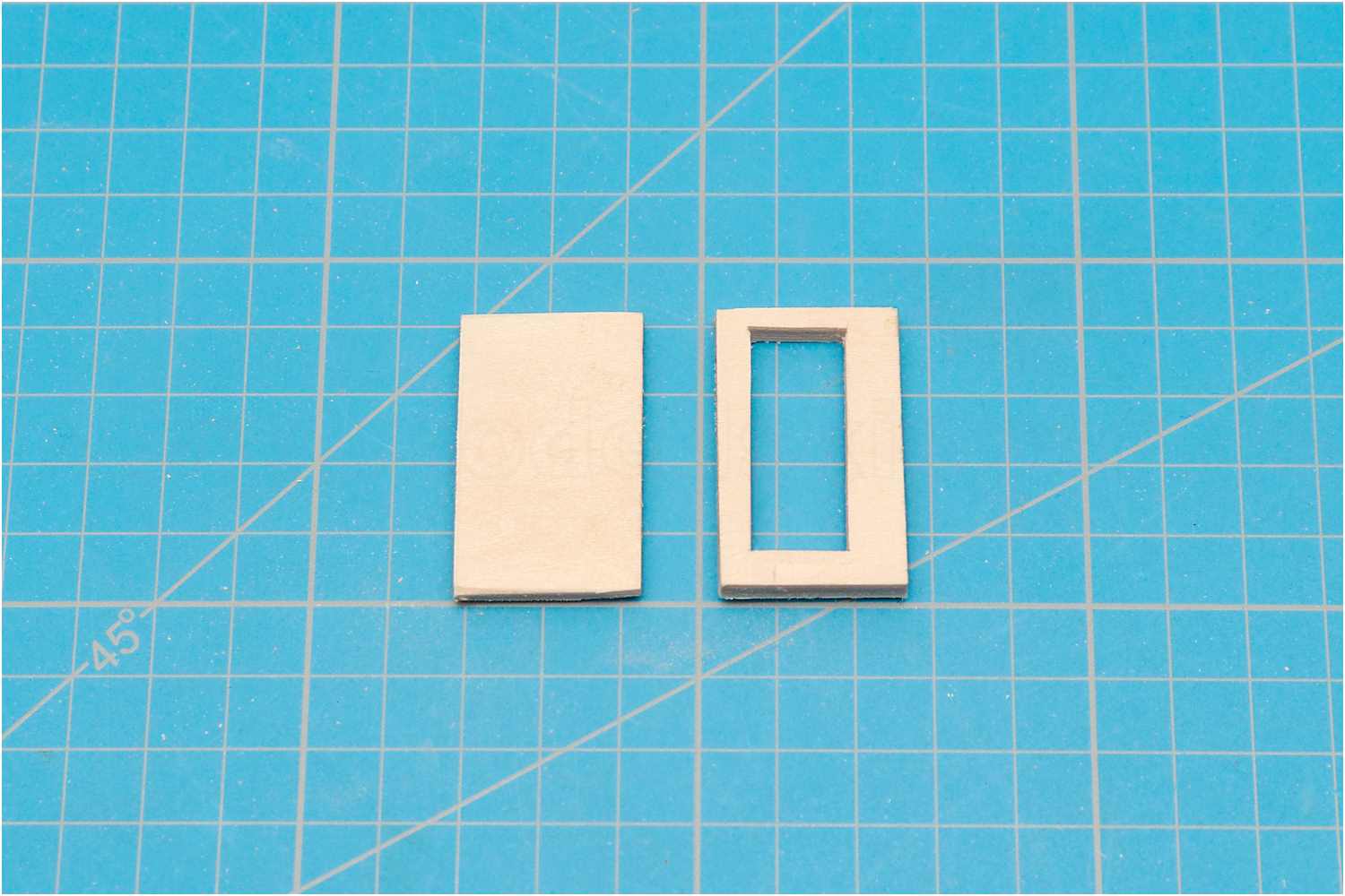 Eine entsprechende Schablone klebe ich auf ein Holzbrettchen, fräse die Fugen für die Treppenstufen und schneide die Stufen aus einer Furnierleiste zu.