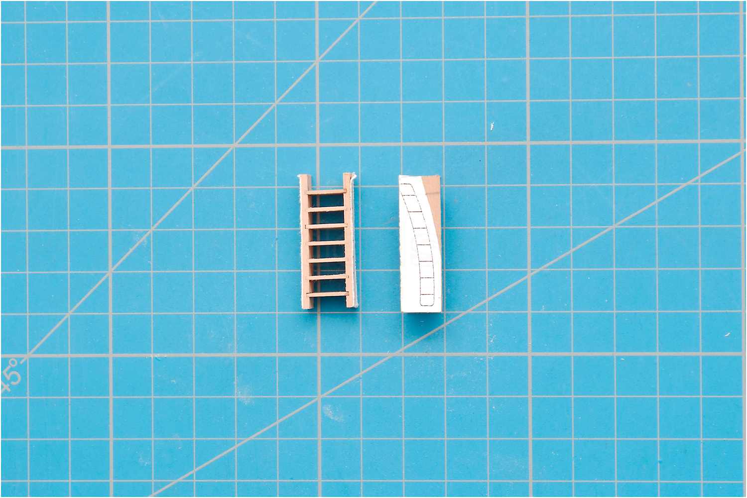 Die Form der Wangen folgt der leichten Wölbung der Rumpfaußenseite, jedoch habe ich die Treppe erst als "Kasten" zusammengeklebt und mir dazu eine Klebehilfe angefertigt, um die Stufen genau im rechten Winkel zwischen die Wangen kleben zu können.