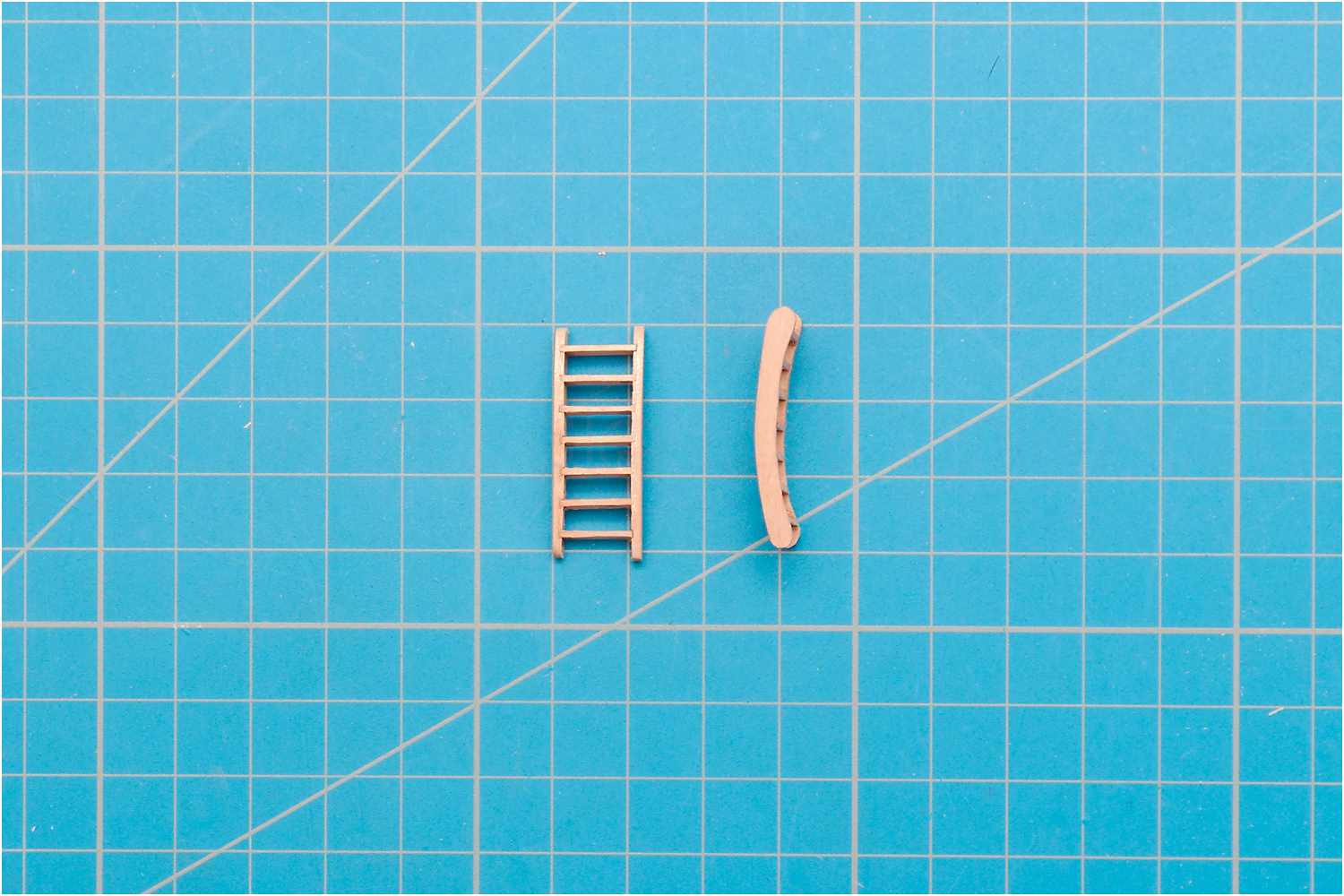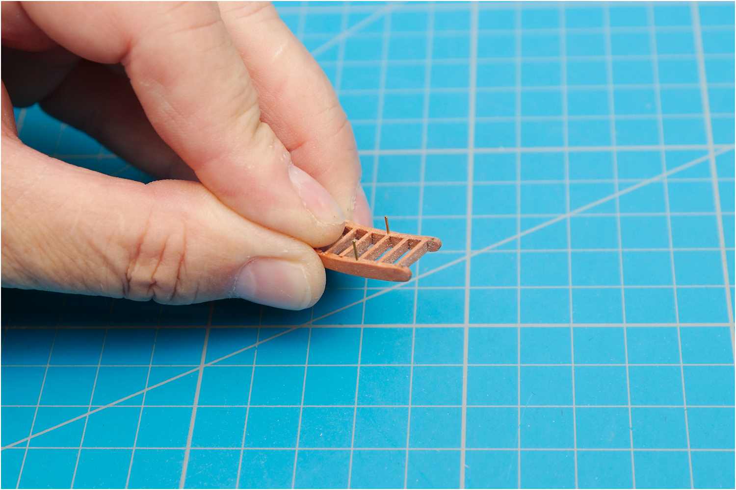 Die Treppe ist zwar im Original abnehmbar, damit dieses Detail aber dauerhaft am Modell verbleibt und nicht verloren geht, habe ich zwei Messingstifte an der Hinterseite angebracht, passende Löcher ins Bergholz gebohrt und so die Treppe sicher verklebt.