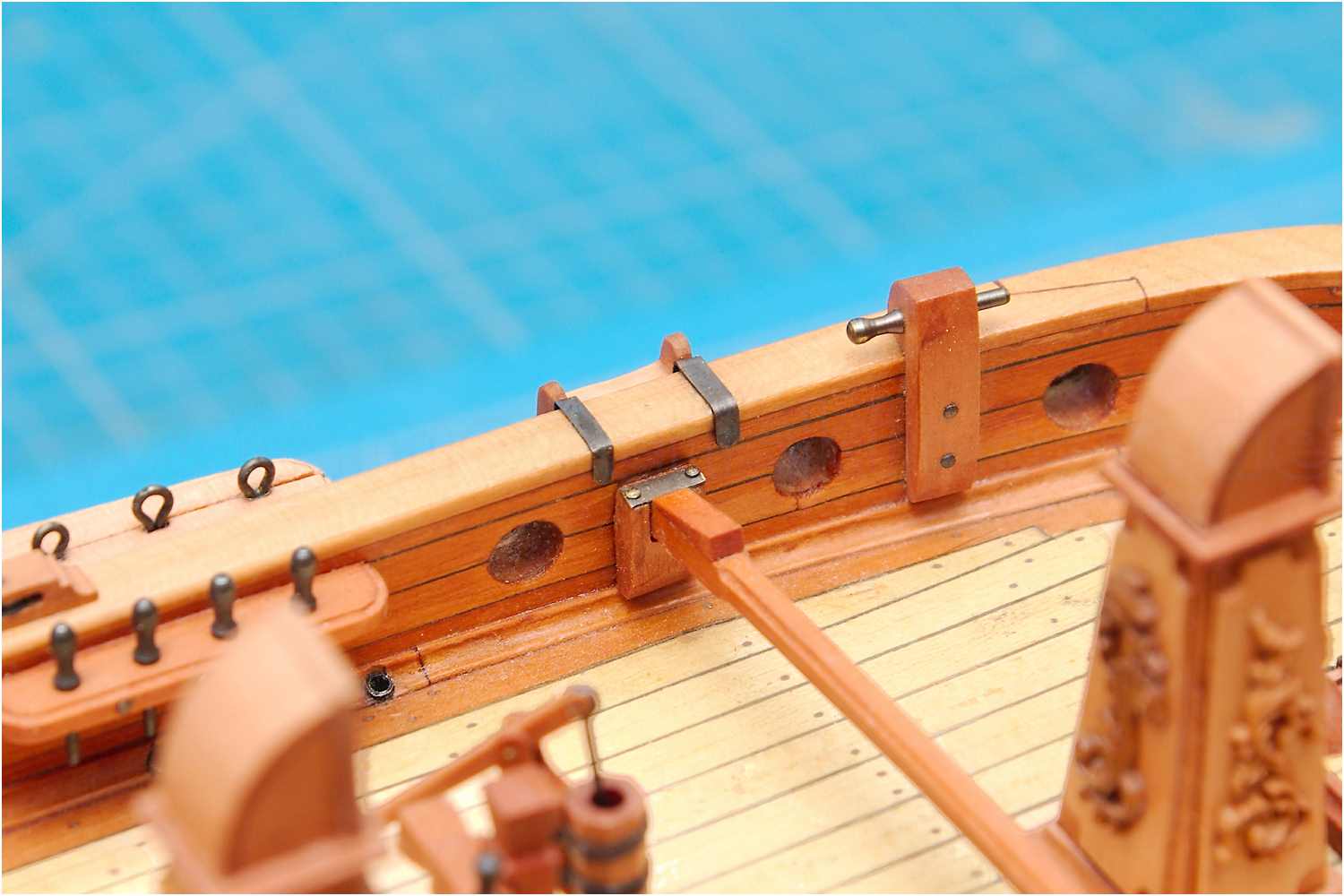 Die Treppen haben abschließend noch einen Metallbeschlag aus brüniertem Messing erhalten, mit dem sie über das Dollbord gehängt werden können.
