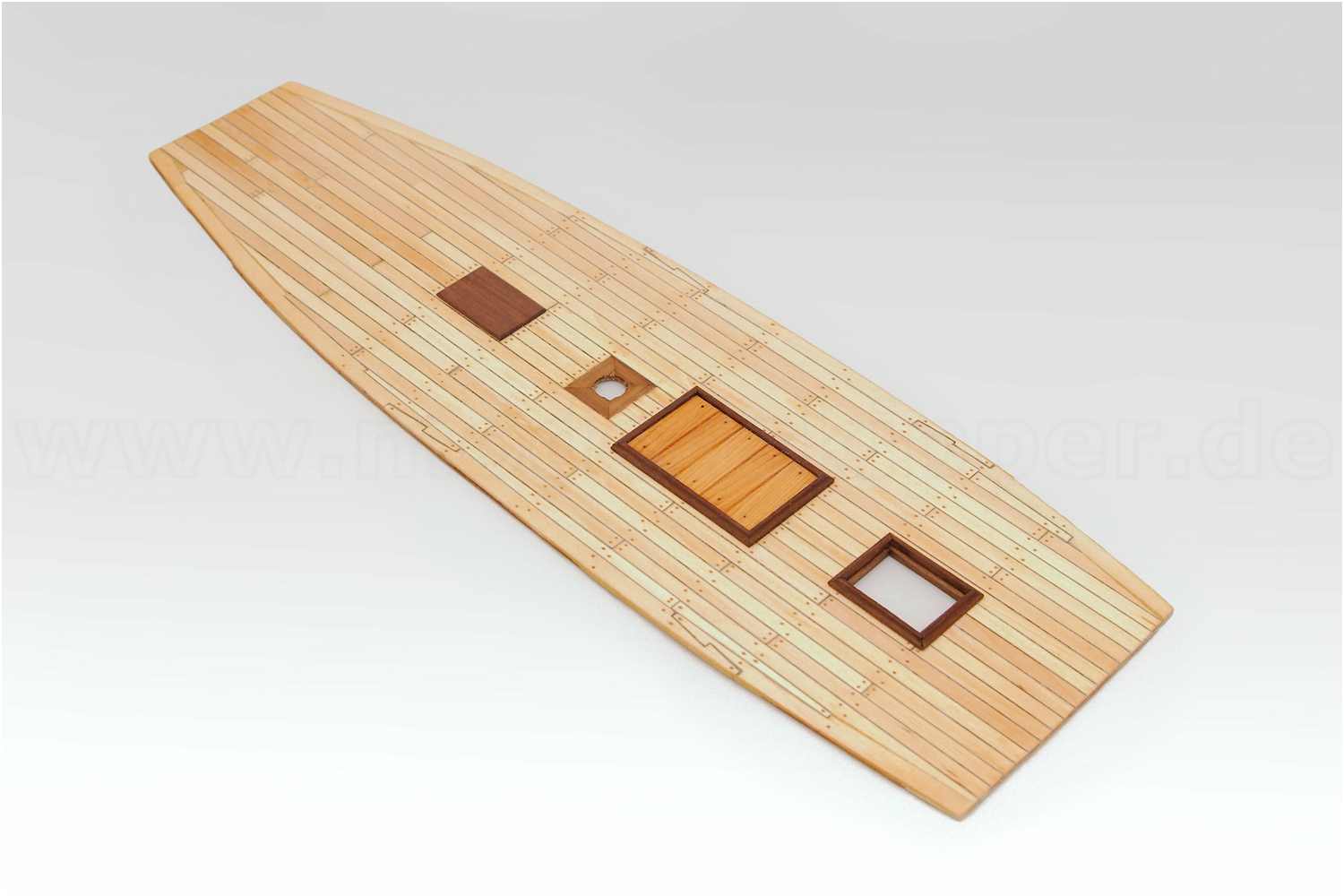 Bei einem älteren Projekt habe ich für die Decksplanken Ahorn verwendet. Hier störte mich allerdings, dass bei diesem Holz nach der Behandlung mit Lack oder Firnis oftmals eine Art "Mosaikmuster" zu sehen ist.