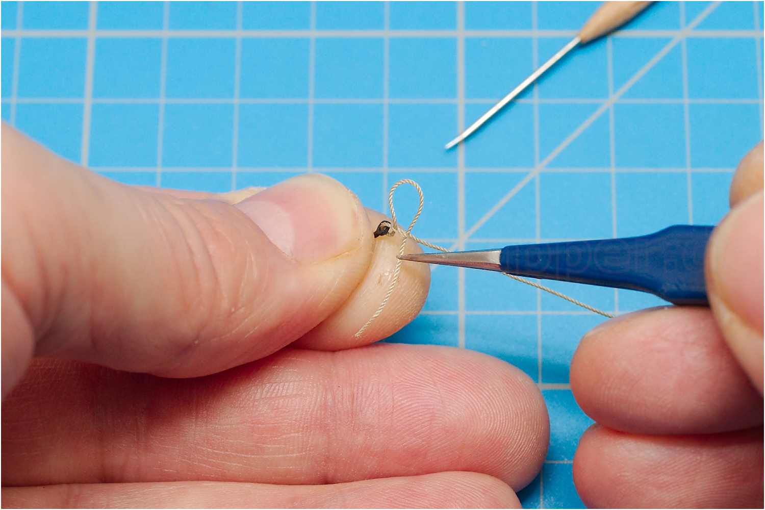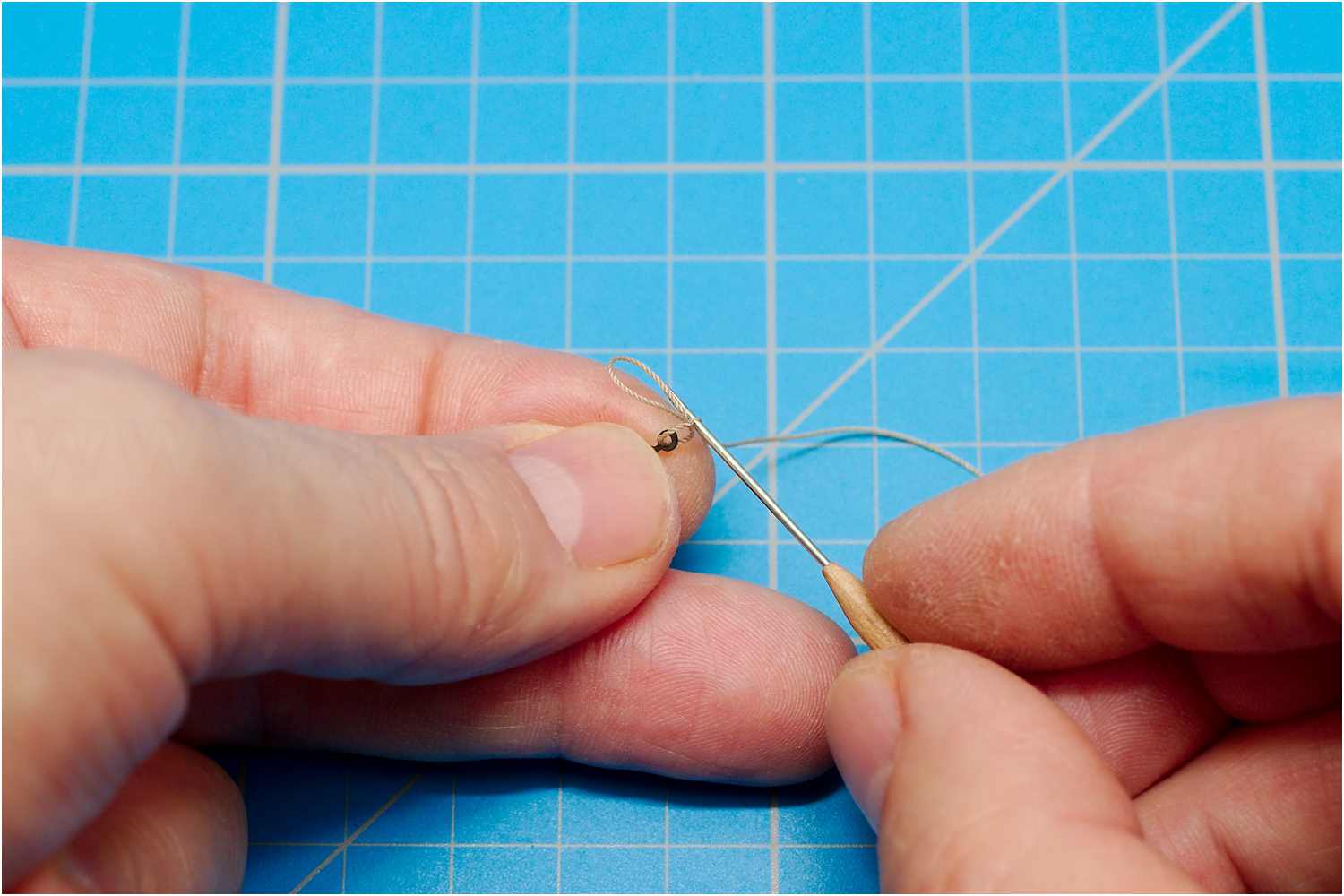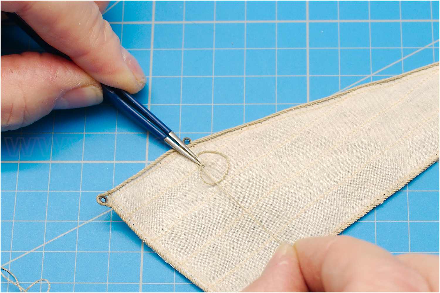 Auf der Rückseite wird dann wieder eine Knoten in das Bändsel gebunden.