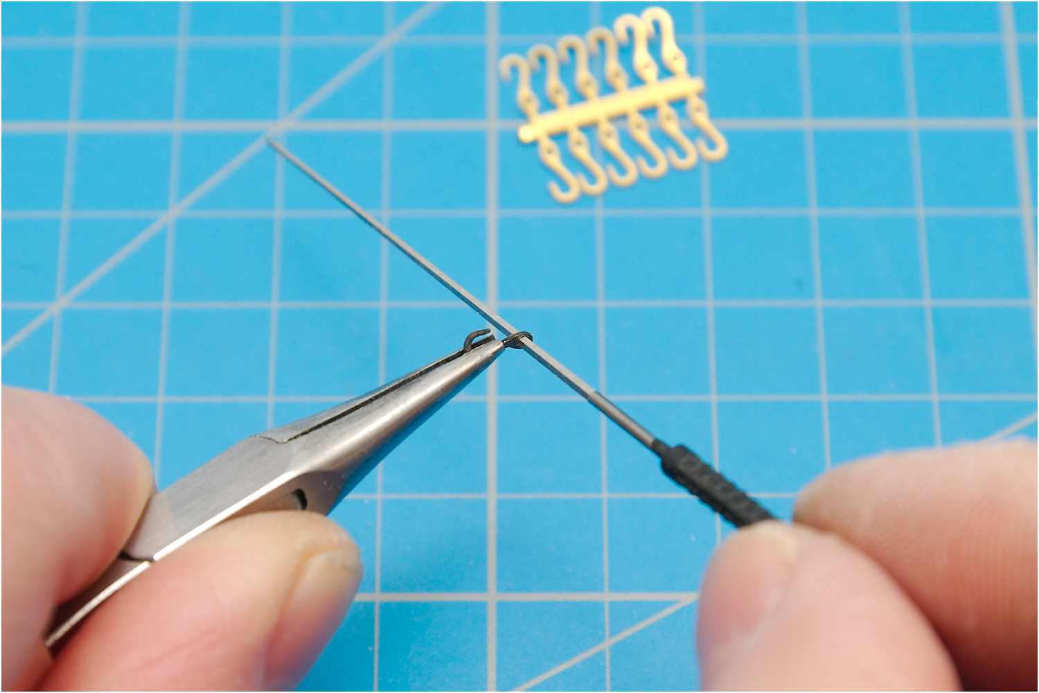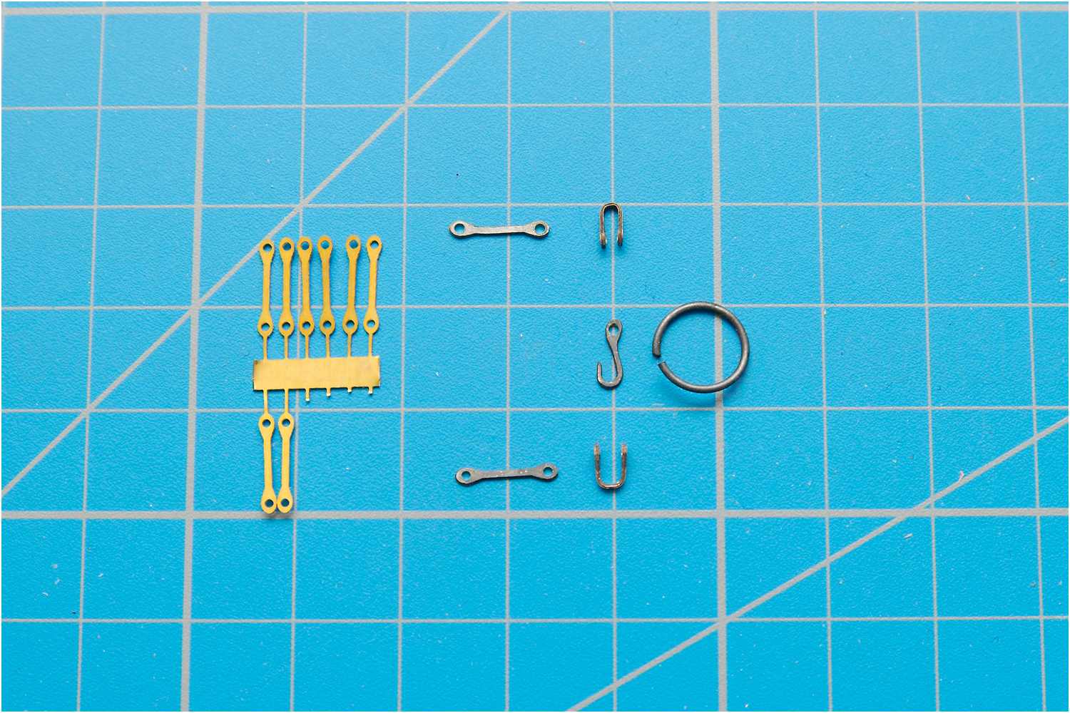 Haken und Bügel sind Ätzteile, bei denen ich mit einer Reibahle die Bohrungen für den Ring vergrößere.