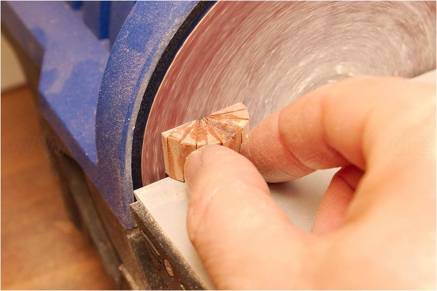 Beim zweiten Versuch prüfe ich hin und wieder den Winkel nach dem Ankleben eines Segments und korrigiere zusätzlich die Klebeflächen am Tellerschleifer.