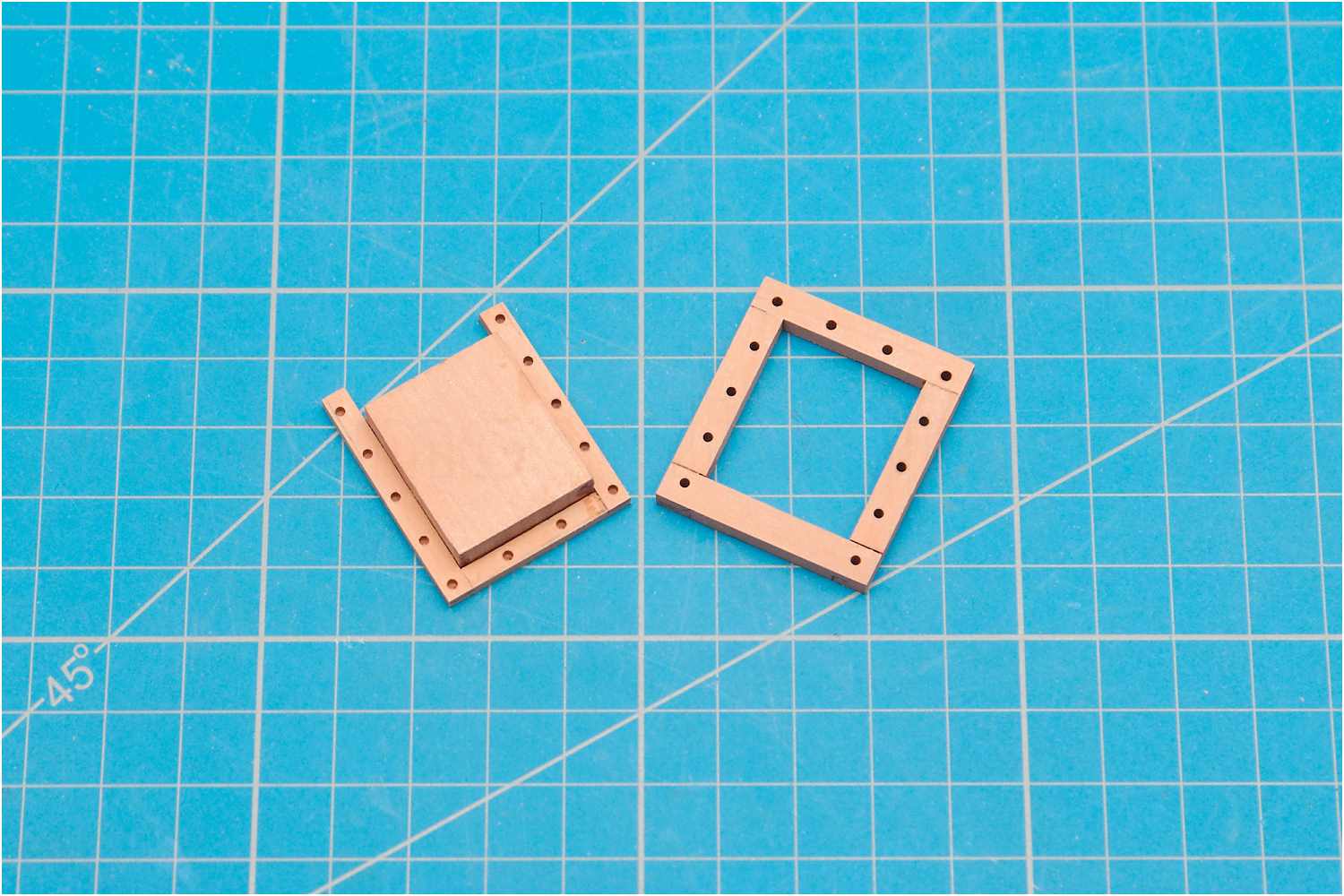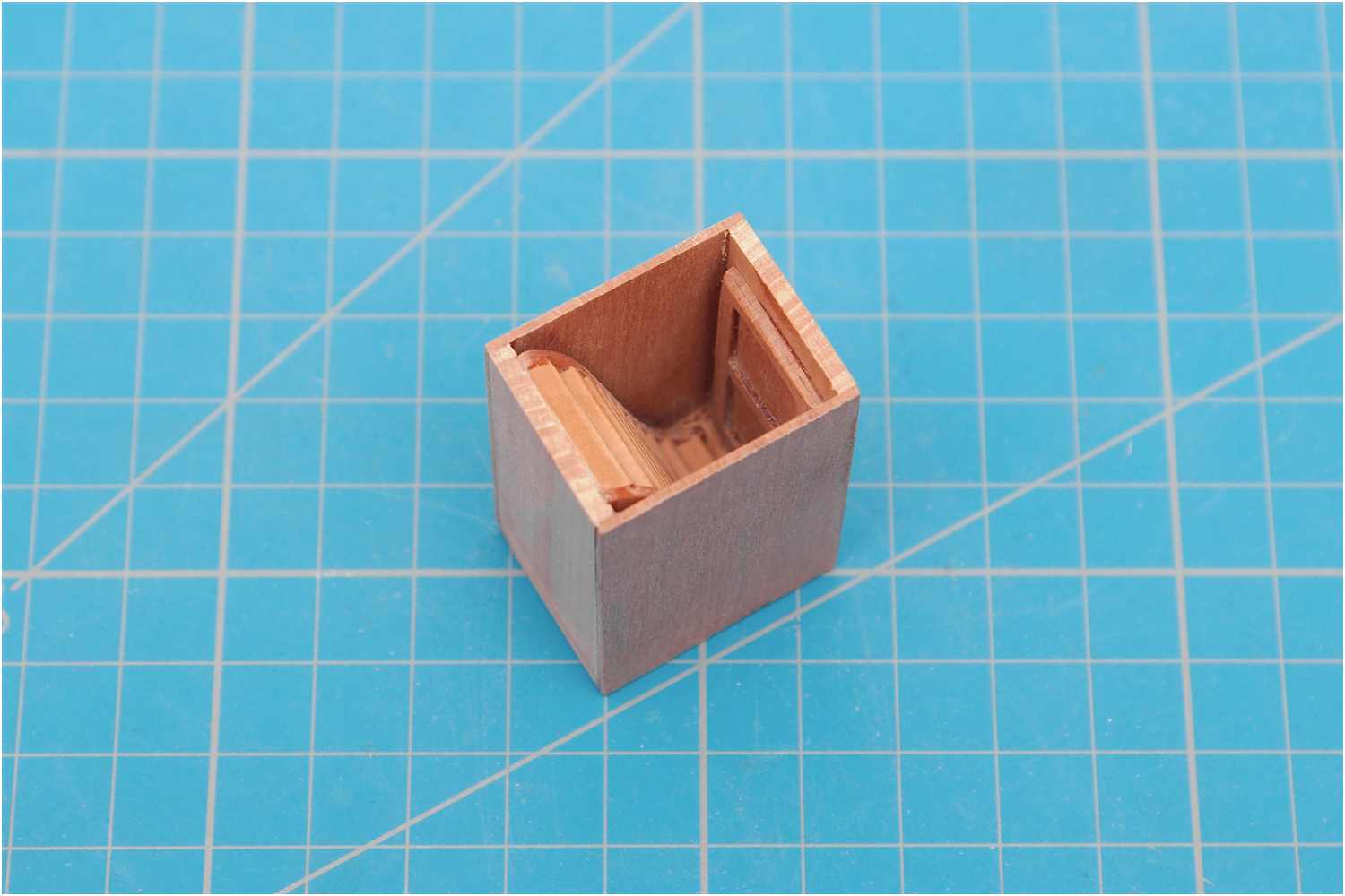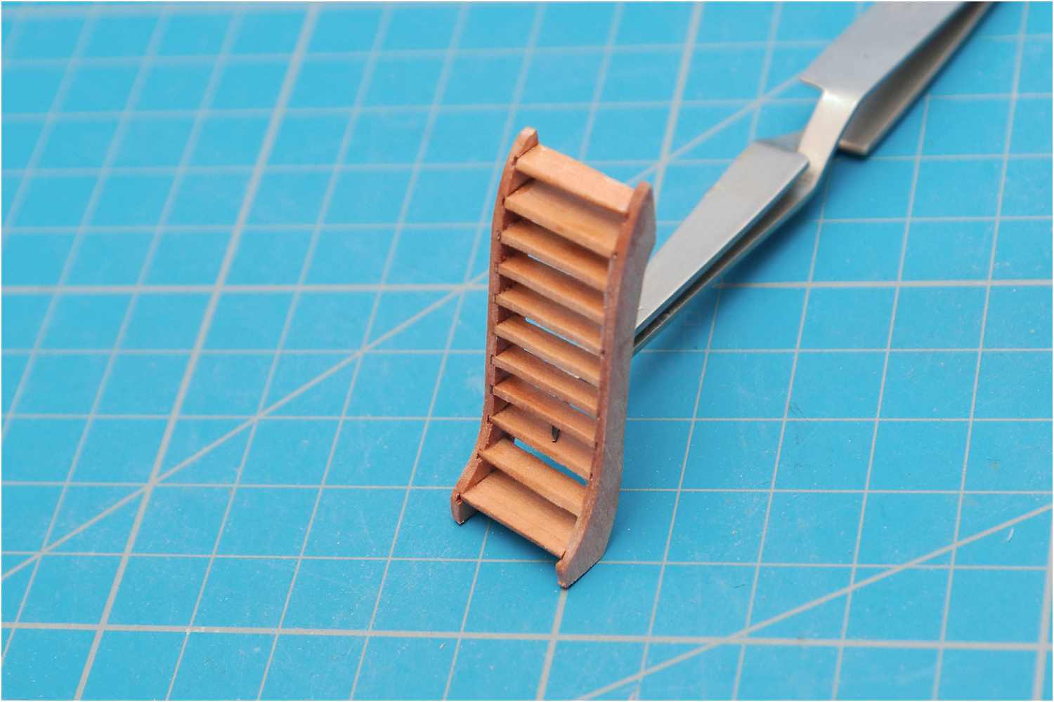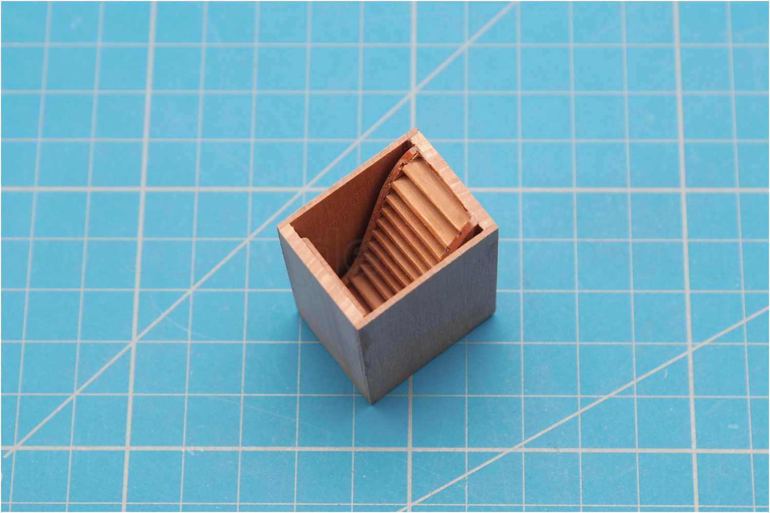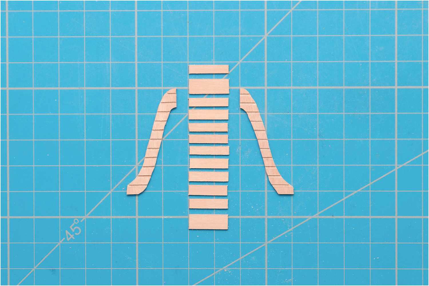 Ich drucke mir die Wangen der Treppe aus, fräse Fugen für die Stufenbretter, die aus 1-mm-Furnierholz gefräst wurden und klebe die Treppe zusammen.