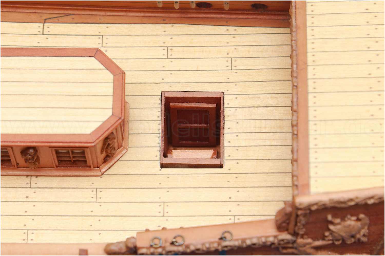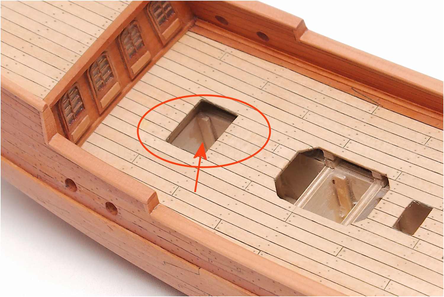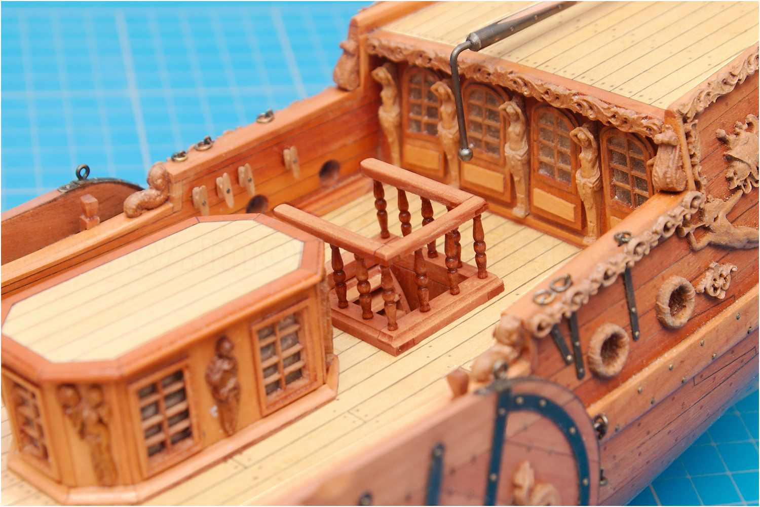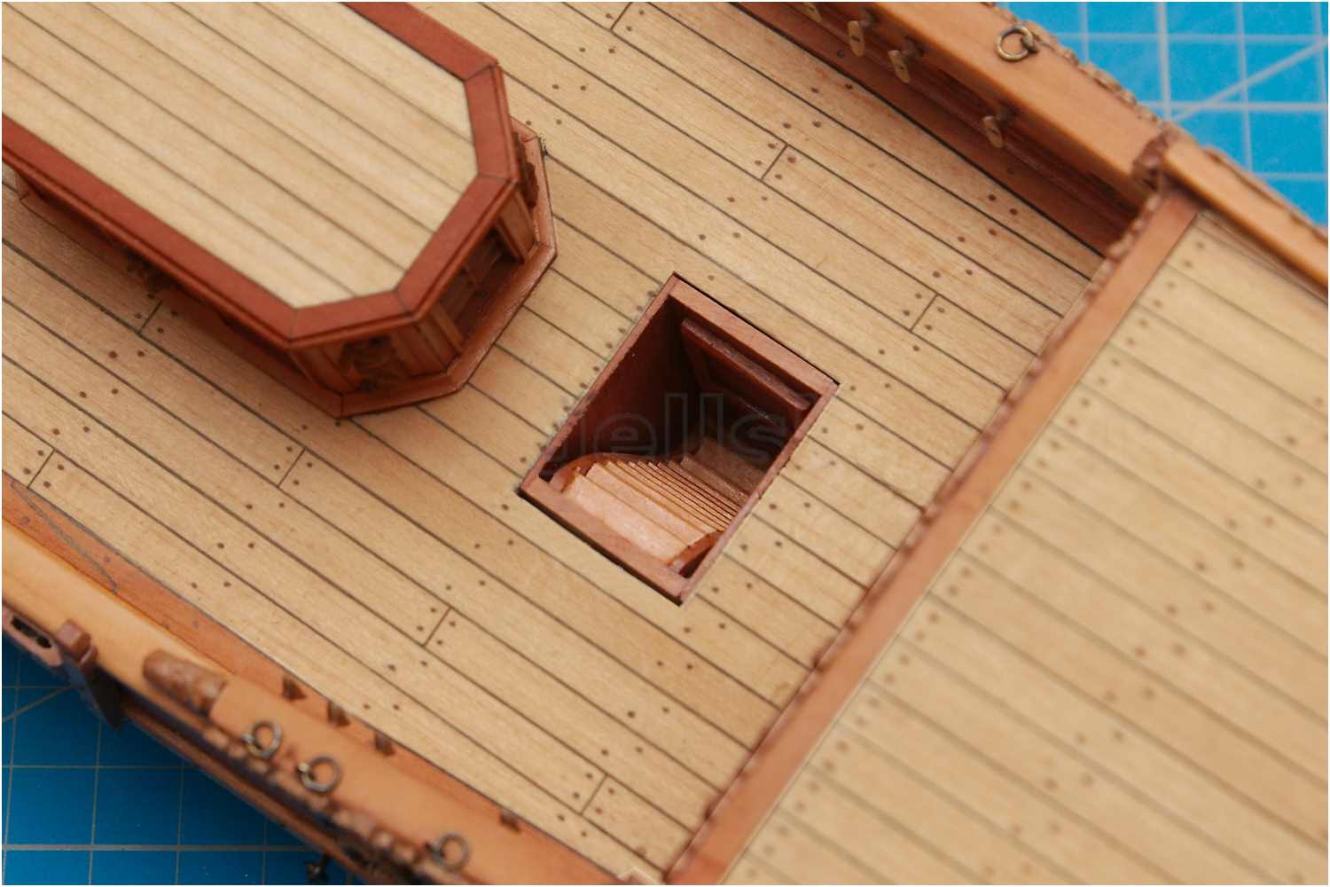Der Schacht des Niedergangs ist in den Rumpf eingesetzt und das Geländer aufgeklebt.