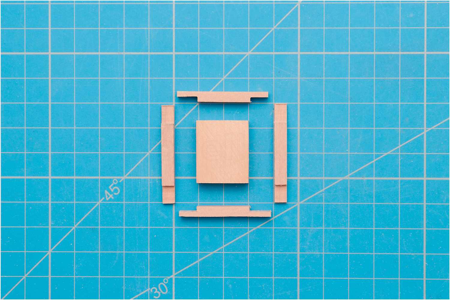 In die Süllleisten fräse ich einen Absatz für eine überlappende Eckverbindung und klebe diese mit Hilfe des Holzklötzchens exakt rechtwinklig zusammen.