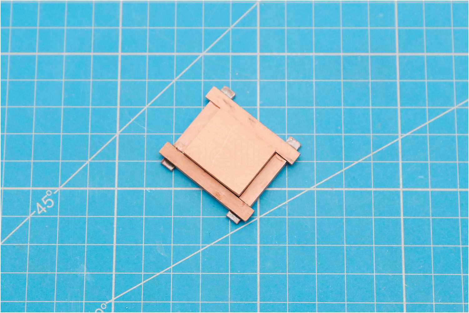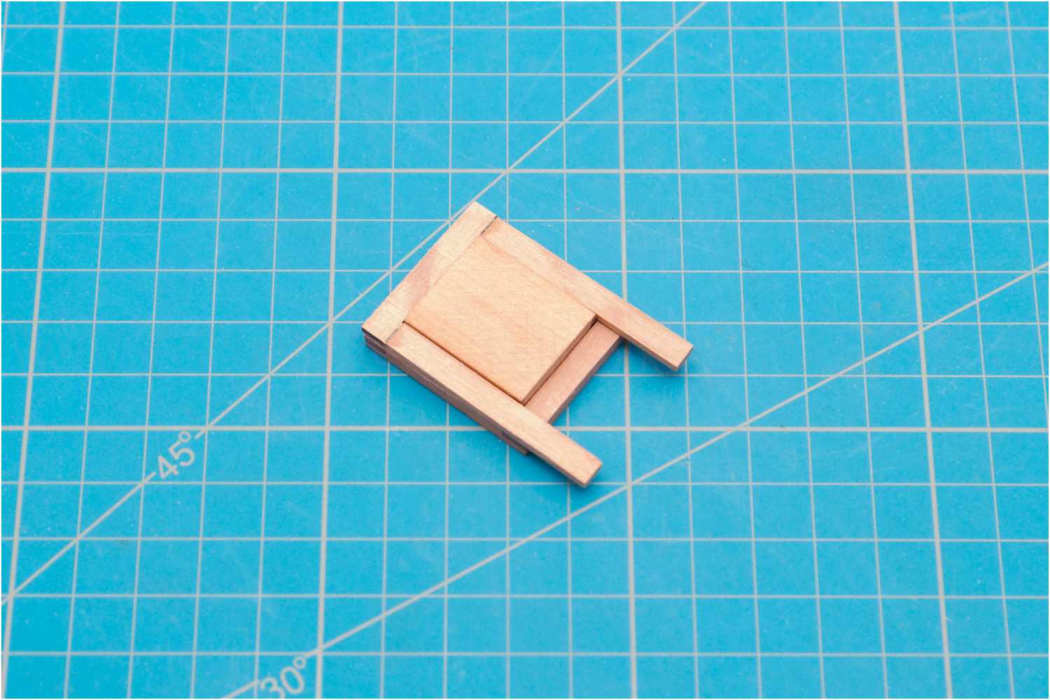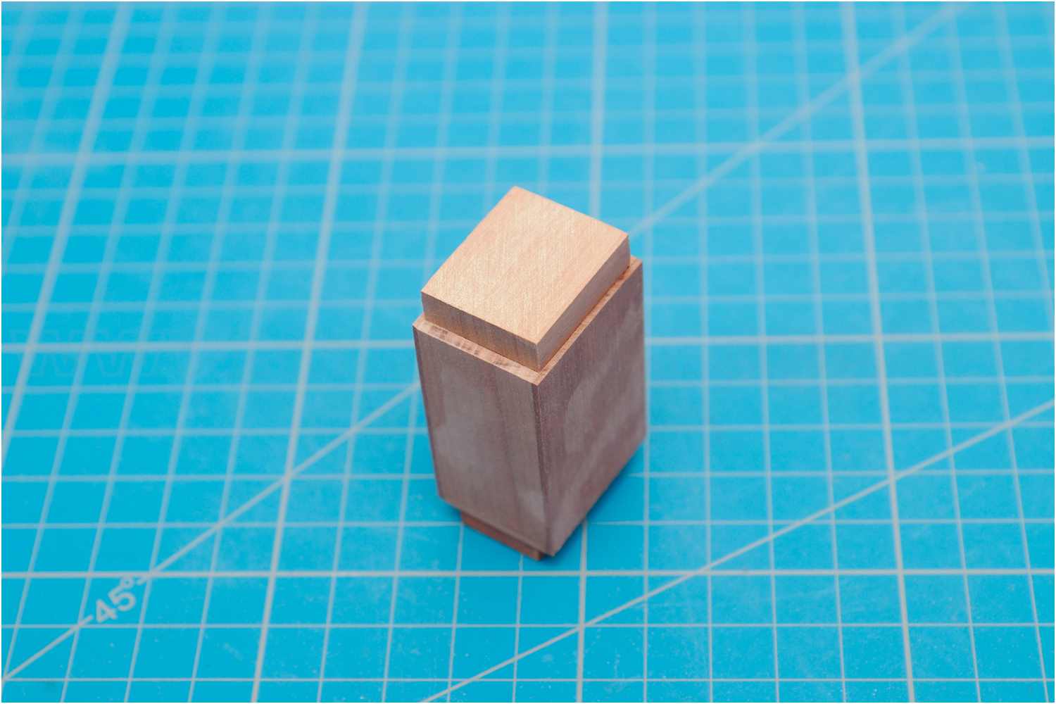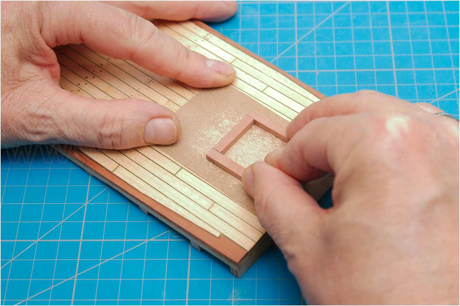 Für die Anfertigung des Sülls säge ich mir einen kleinen Holzklotz als Klebehilfe zu, der genau oben in den Schacht vom Niedergang passt und das Süll somit bündig mit dem Schacht abschließt.