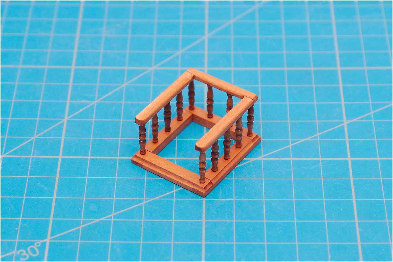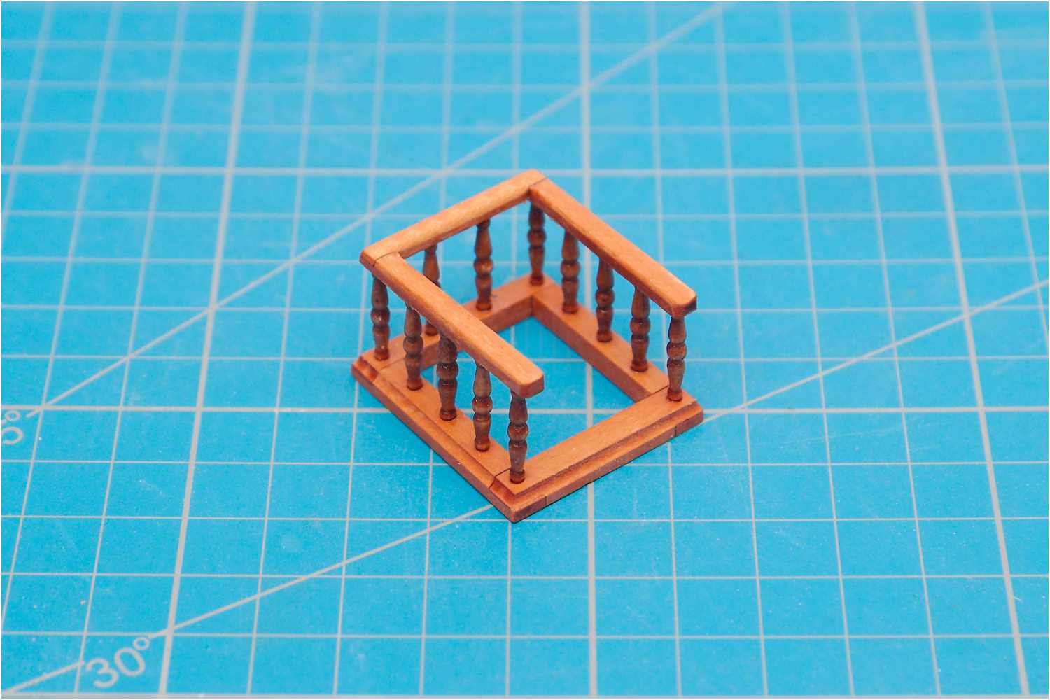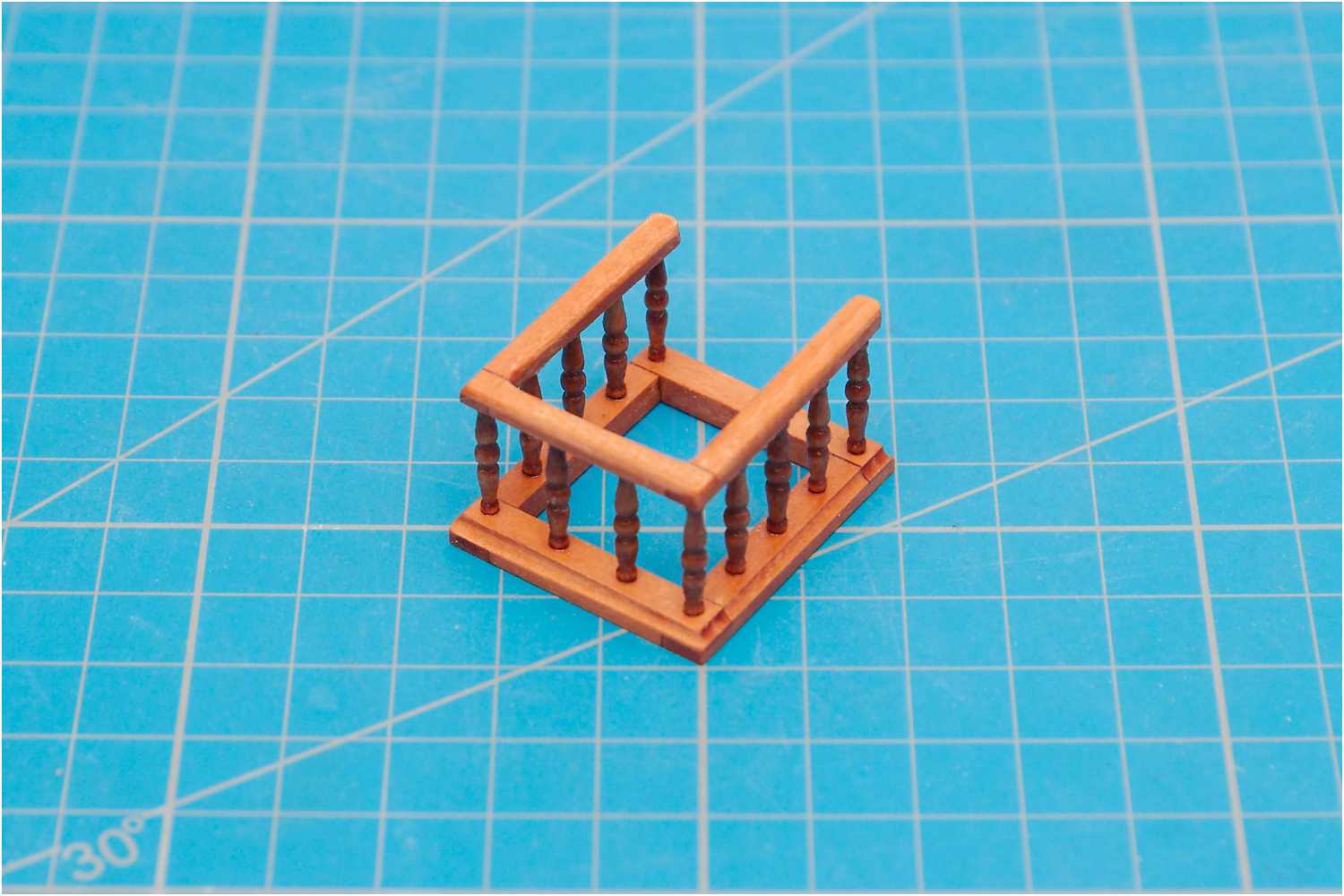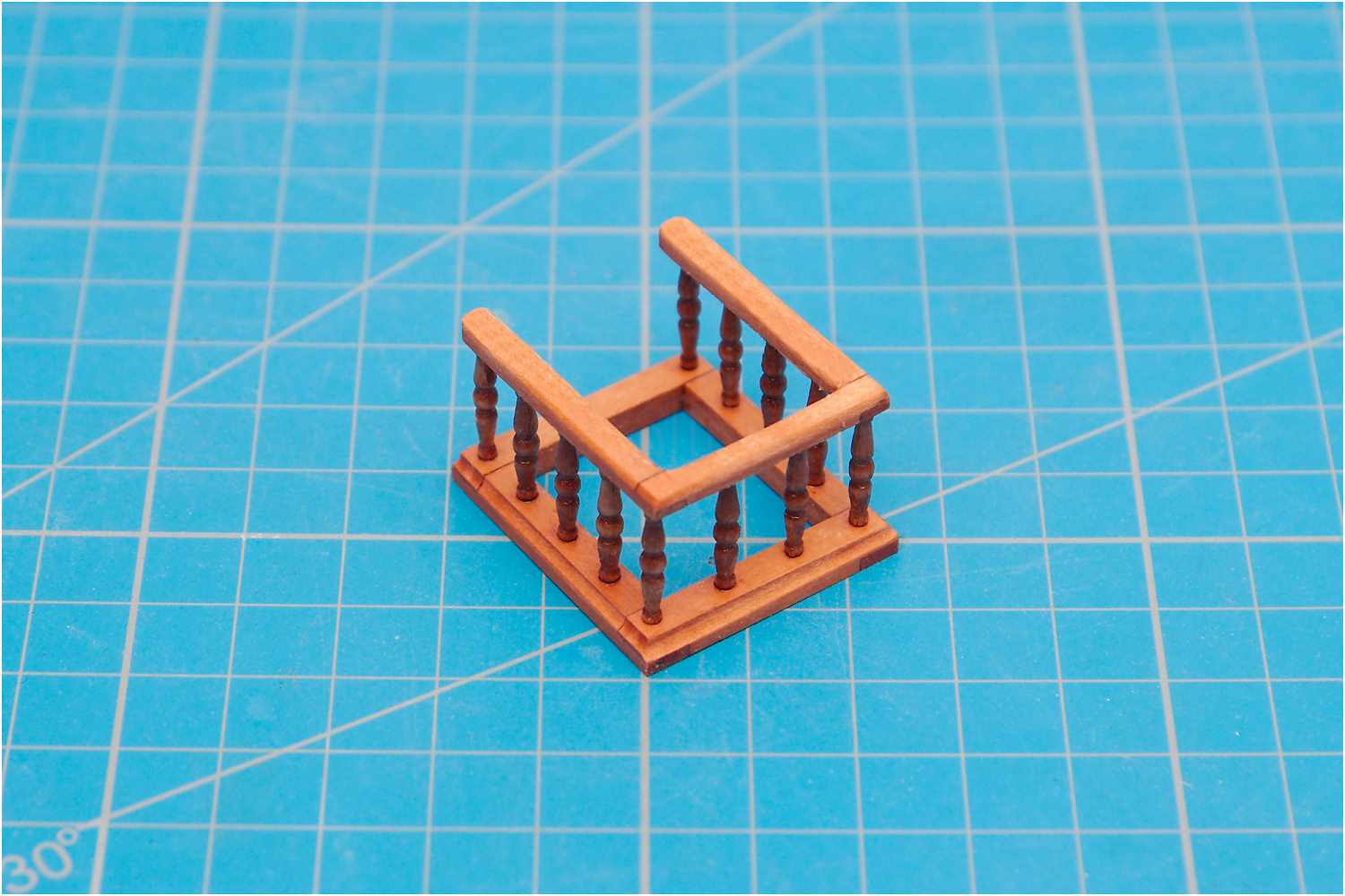 Die Geländerstützen sind eingeklebt, die Außenseiten des Sülls wurden profiliert und der Handlauf abgerundet.