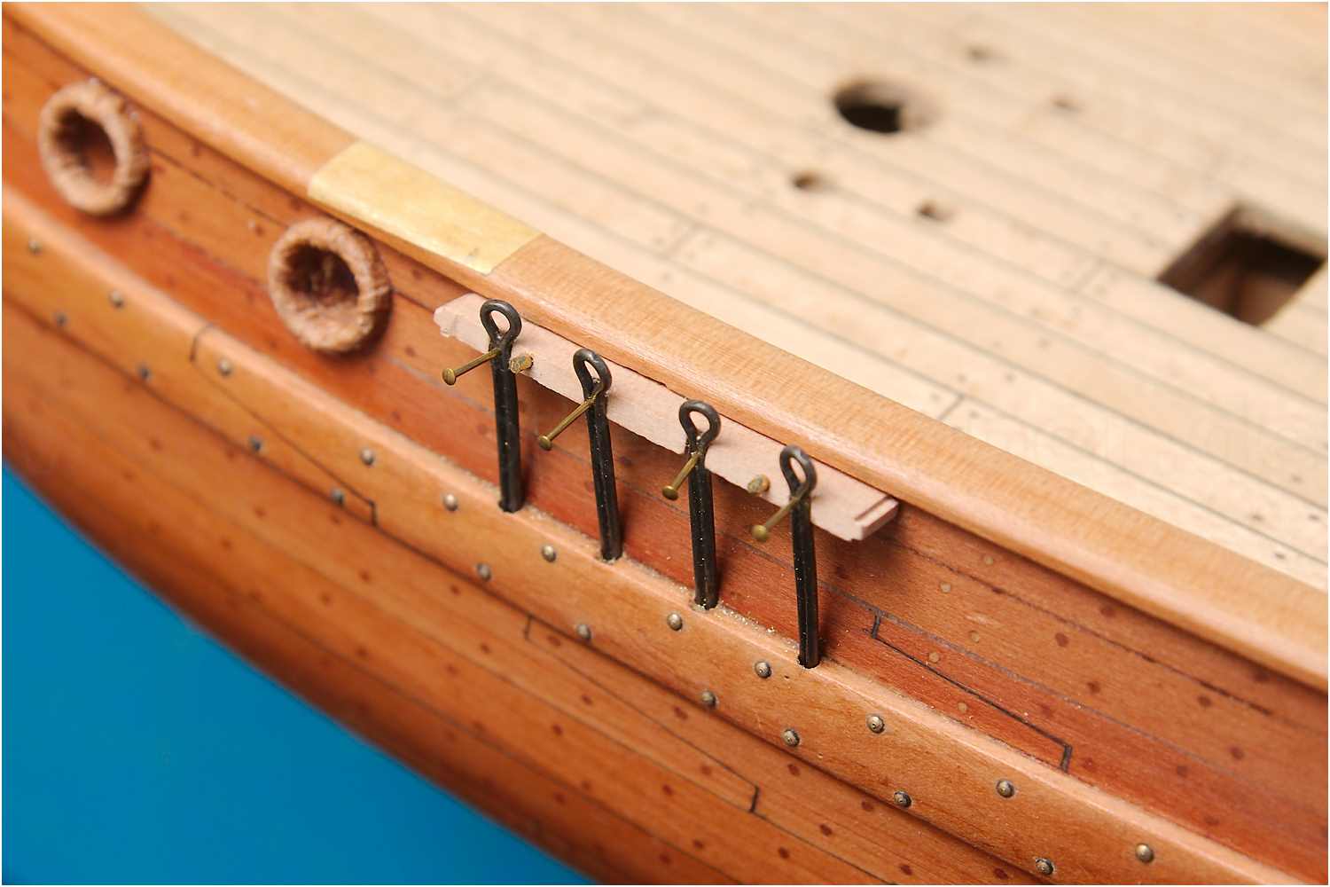 Da die Rüsteisen aber so keinen Halt hätten, um den Zug der Wanten abzufangen, bohre ich kurz unter dem Auge ein Loch und fixiere das Rüsteisen verdeckt im Rüstbrett mit einem Messingstift.