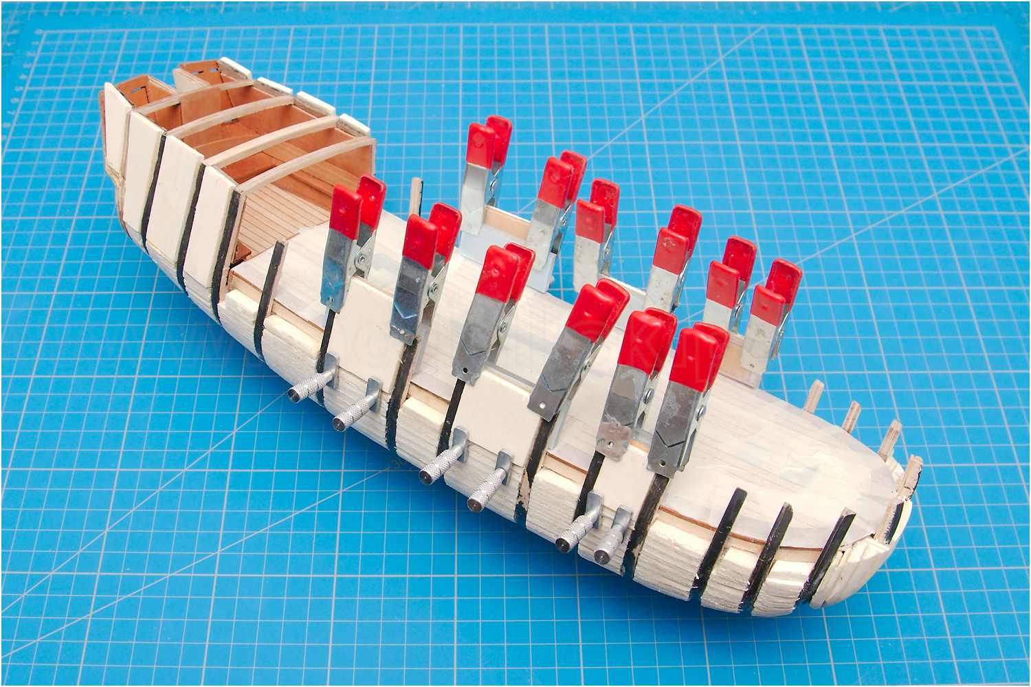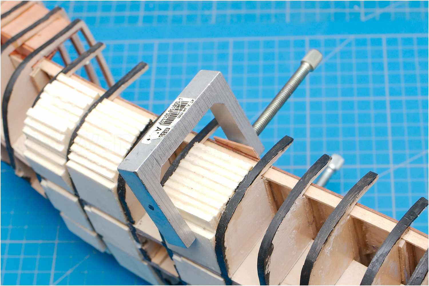 Dann werden, beginnend von der Unterkante Deck zum Kiel, schichtweise Füllhölzer eingeklebt und alles mit einer Zwinge fixiert.