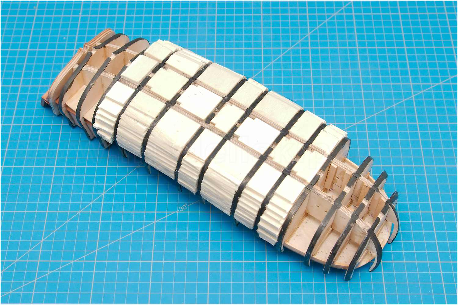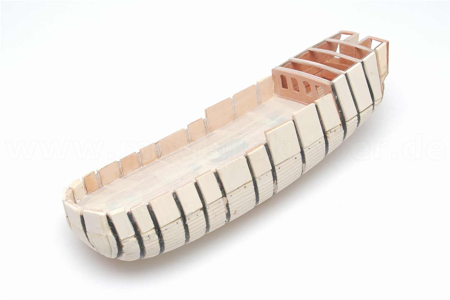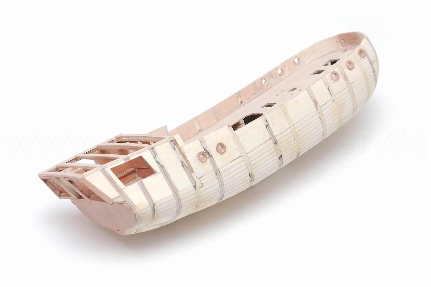 Beim Projekt der Fregatte Berlin habe ich bei der Rumpfbeplankung festgestellt, welche Vorteile ein fertig gefräster Rumpf hat: Ein massiver "Holzklotz" kann nicht mehr arbeiten, behält seine Form und bietet genug Material zum Fixieren der Holzleisten mittels Plankenklemmen o.Ä.