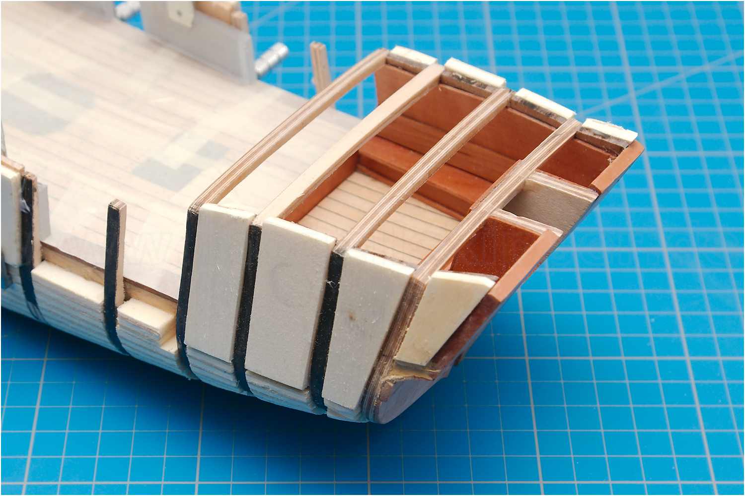 Rumpf komplett geschliffen, Stückpforten eingesetzt und Erkerfenster ausgearbeitet