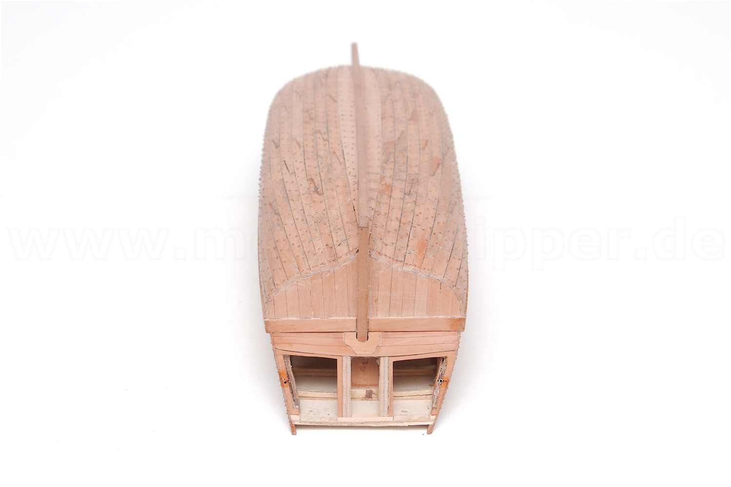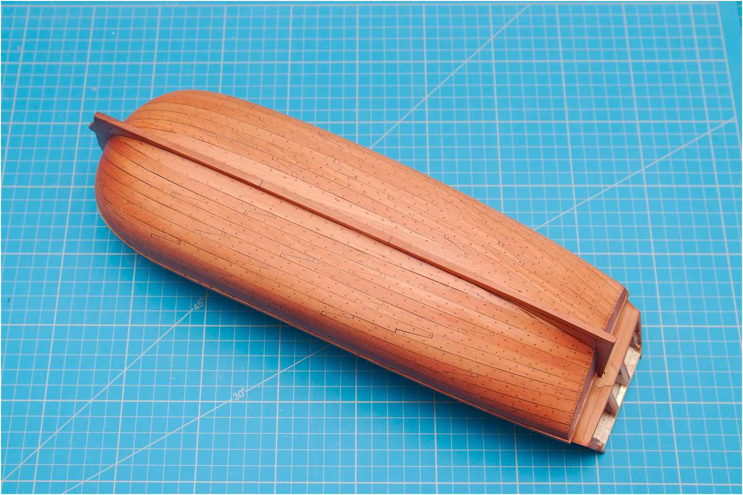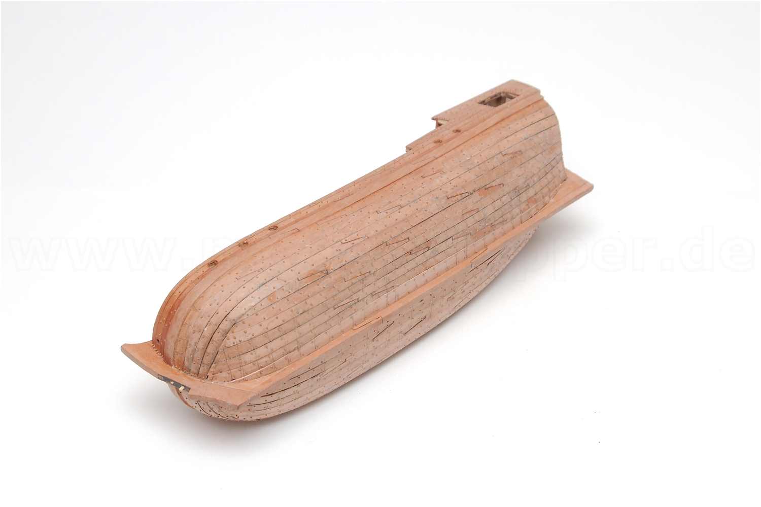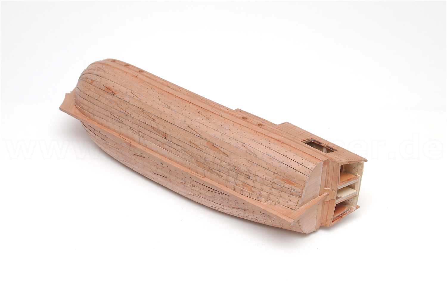 Je mehr Aufmerksamkeit und Mühe in die Herstellung des Basiskorpus gesteckt wird, um so leichter ist die spätere Beplankung. Der hier noch ungeschliffene Rumpf lässt gut die saubere Vorarbeit erkennen.